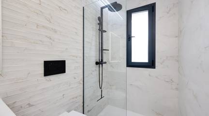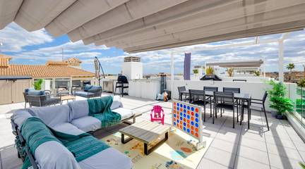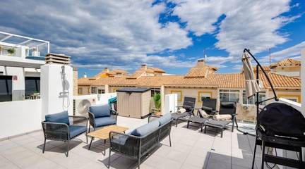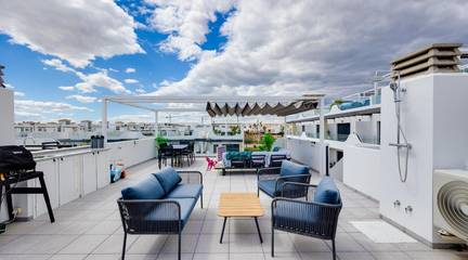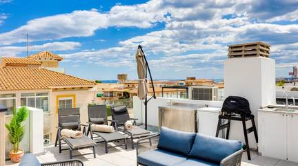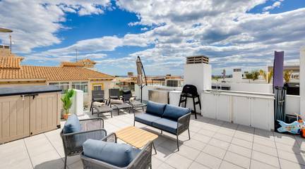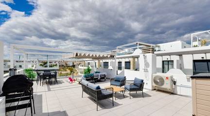Lomas de Caboo Roig, spectacular independent villa with a large plot of 230 m2 and a house on two floors of 140 m2, has 3 bedrooms, one of them on the ground floor, and 3 bathrooms, large living room with integrated kitchen, terrace, driveway, private heated pool and a large solarium with sea views, the house is sold semi-furnished, has air conditioning and is completely energy independent, automatic awnings.
