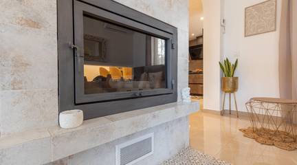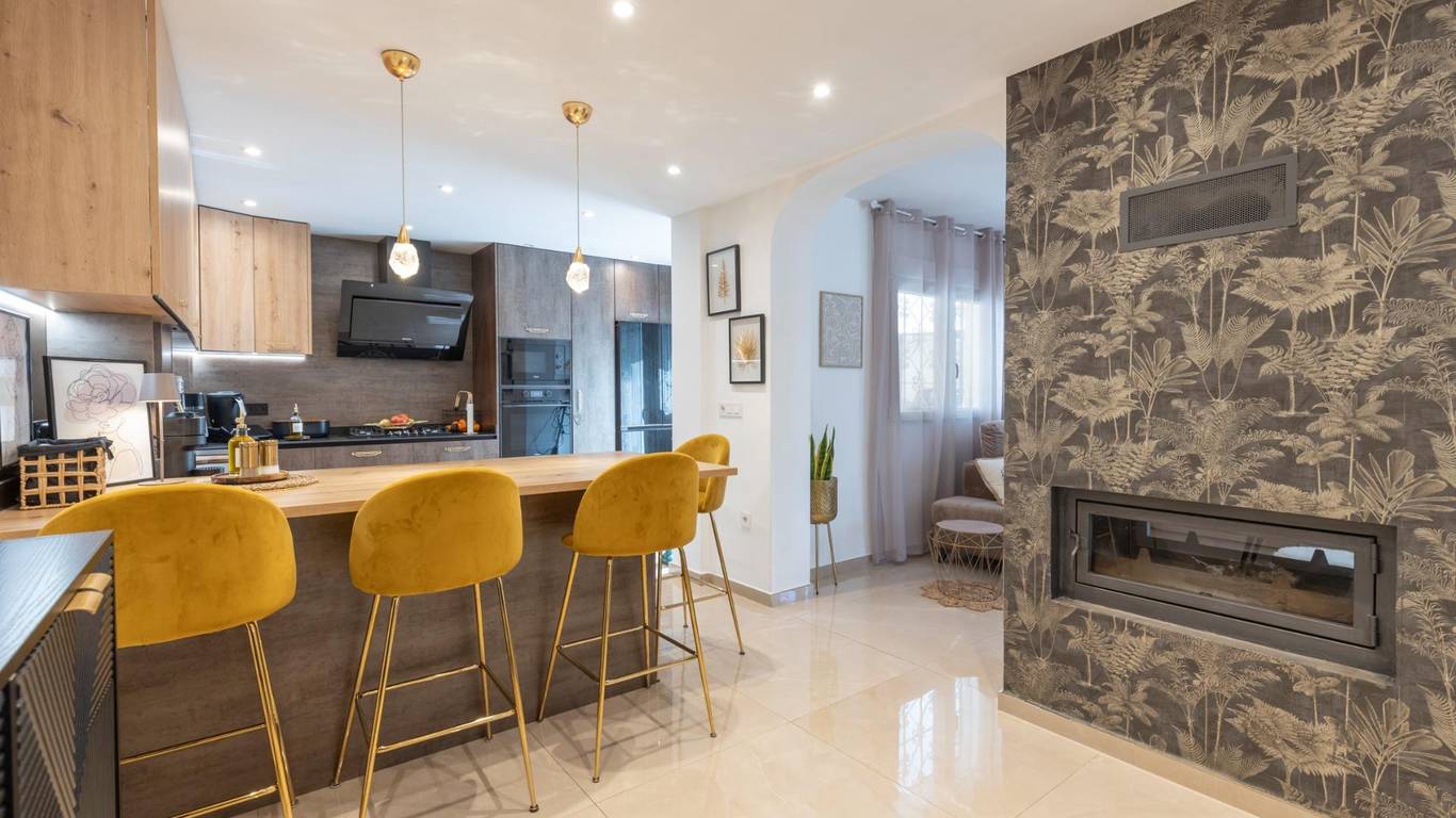 Diseño Open Concept: Salón y cocina se fusionan en un espacio diáfano, pero con carácter. El nexo de unión es una espectacular chimenea en esquina empotrada en un muro divisor que ofrece calidez tanto a la zona de estar como al área culinaria.