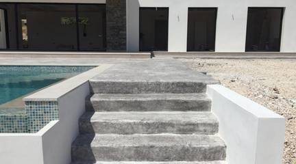 Private swimming pool 4x8 meters with a concrete press sunbathing terrace to connect the house with the pool.