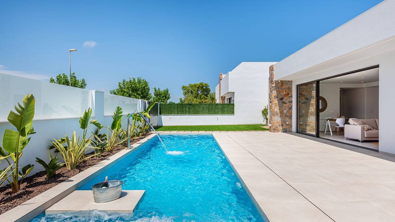 The properties comprise three double bedrooms (all with fitted wardrobes), two bathrooms (en-suite to the master bedroom) and a toilet, a fully equipped modern kitchen (with breakfast bar) and an open plan living/dining area, leading to the spacious tiled garden and private swimming pool.