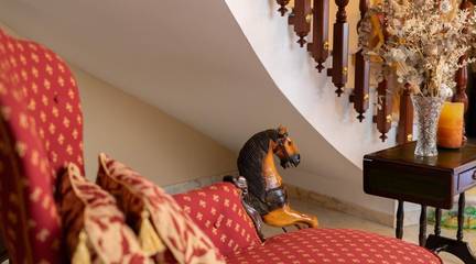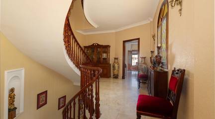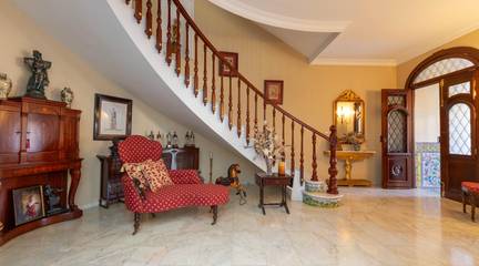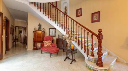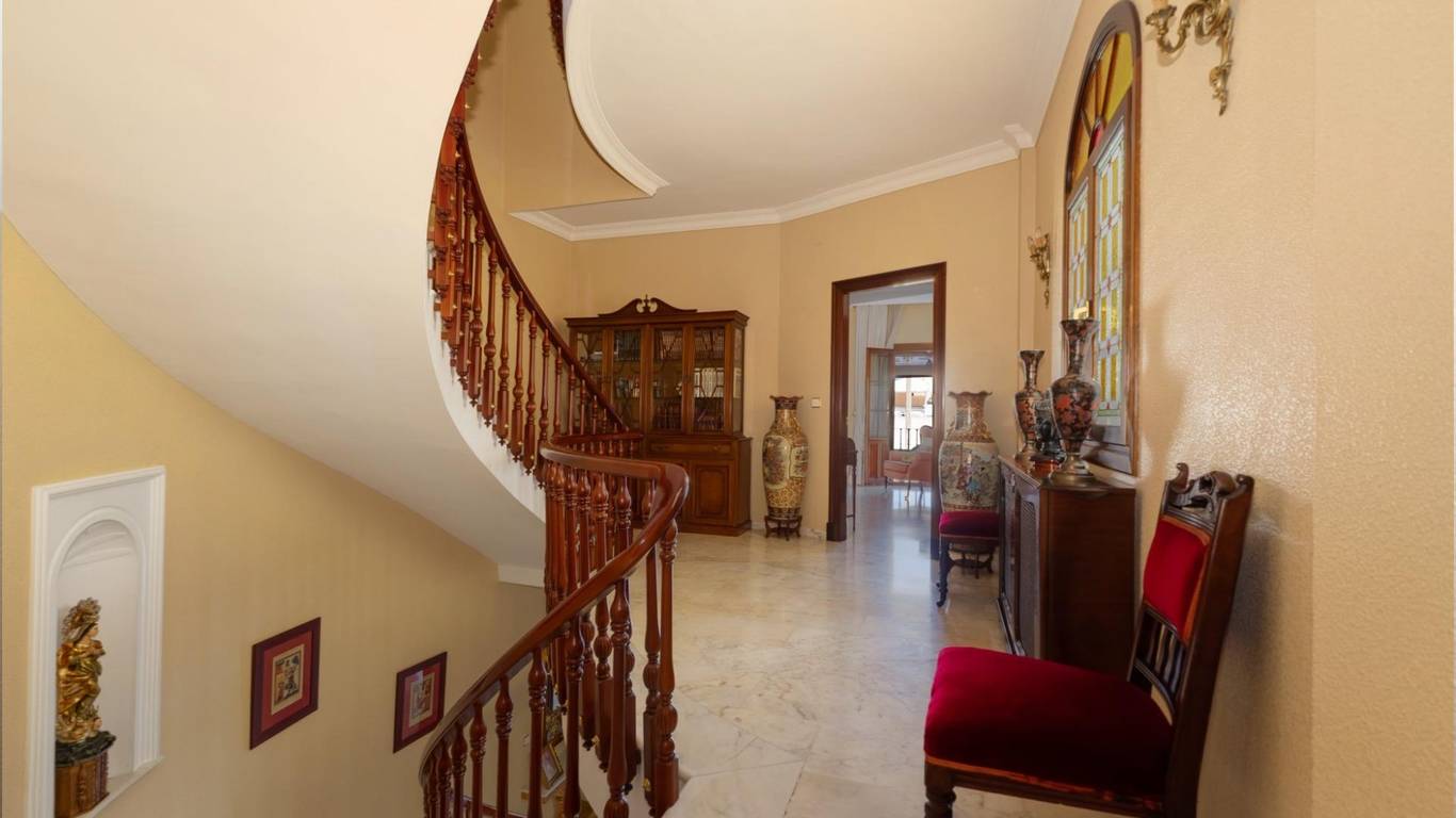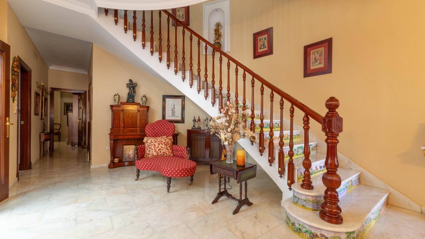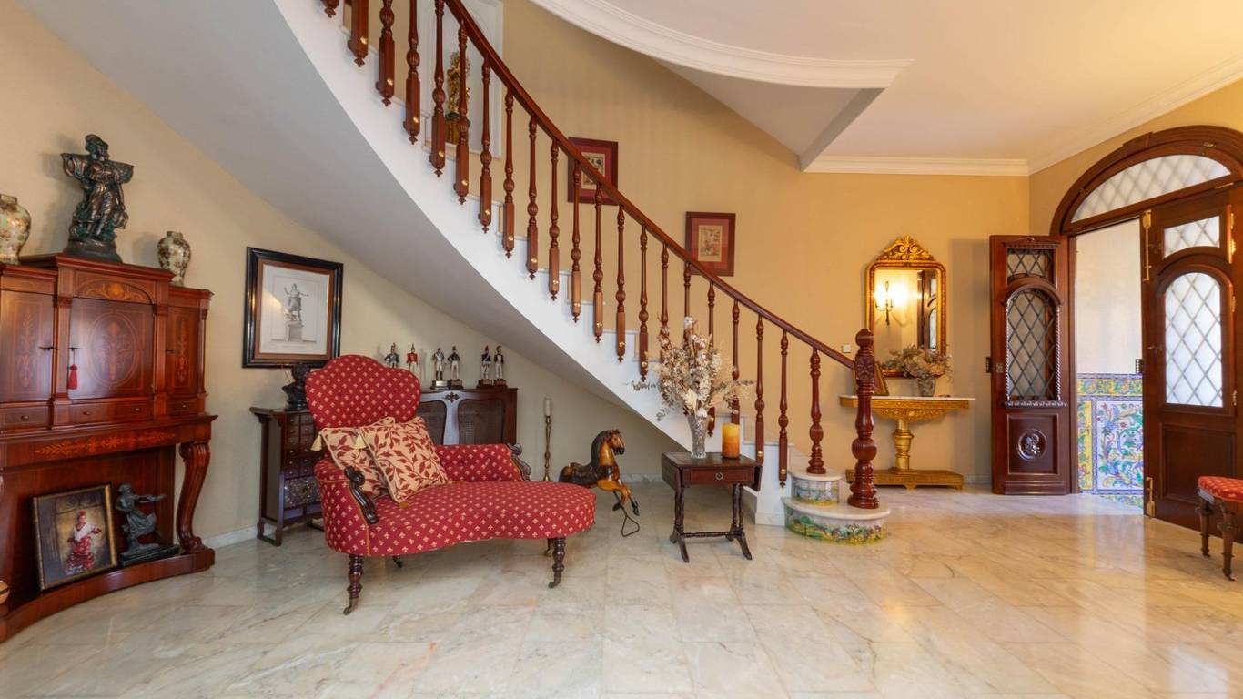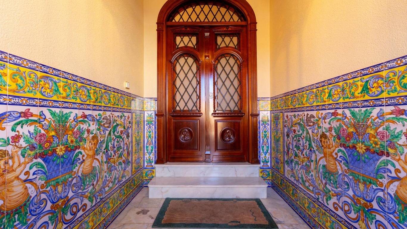 Nada más cruzar el umbral, la madera noble te recibe en un imponente zaguán. con sus azulejos que lo adornan, piezas únicas, pintadas y firmadas a mano por la prestigiosa Fábrica de Cerámica Montalbán de Triana en Sevilla y su imponente puerta de madera noble que rinde homenaje al detalle impreso por un hábil ebanista. Nos recibe una escalera increíble en forma de media luna perfecta con Molduras talladas a mano y curvaturas de una complejidad técnica extraordinaria, imposibles de reproducir con los métodos industriales actuales, recorren estancias y marcos como si el tiempo se hubiera detenido en el mejor momento de la arquitectura andaluza.