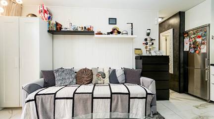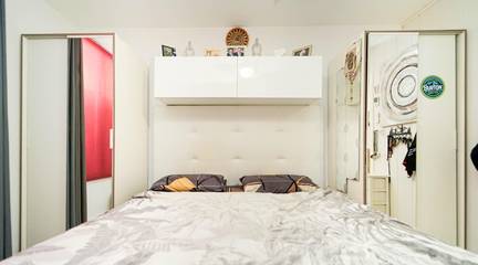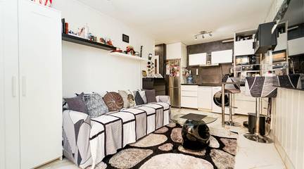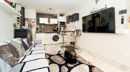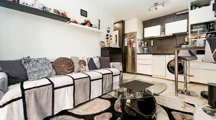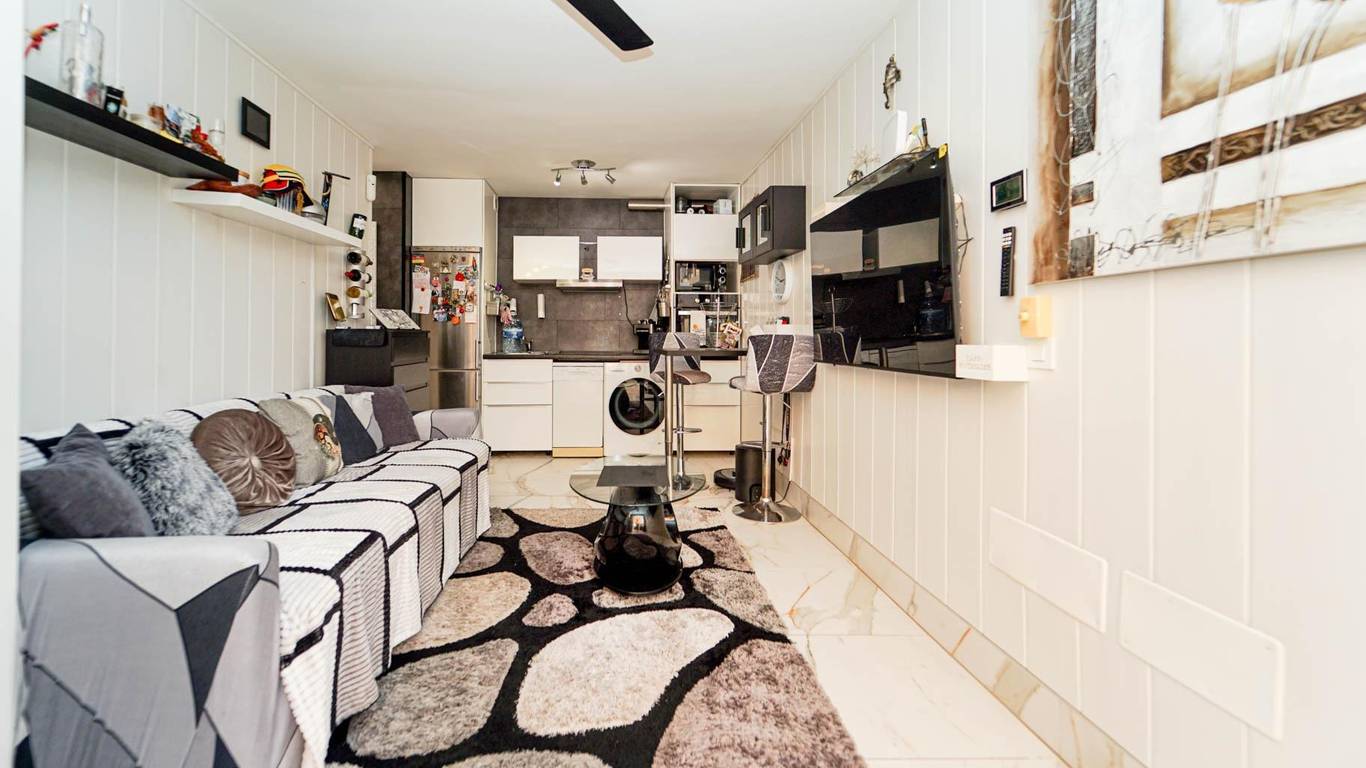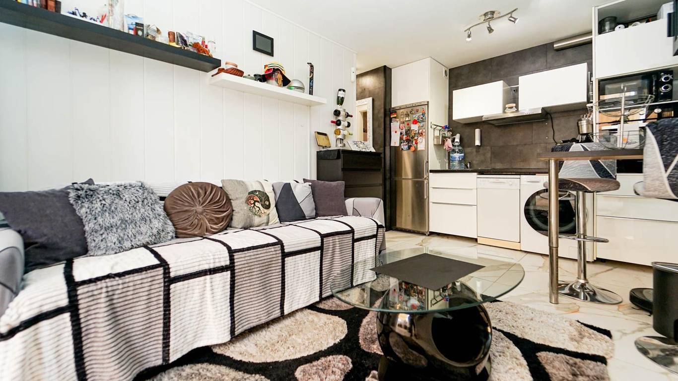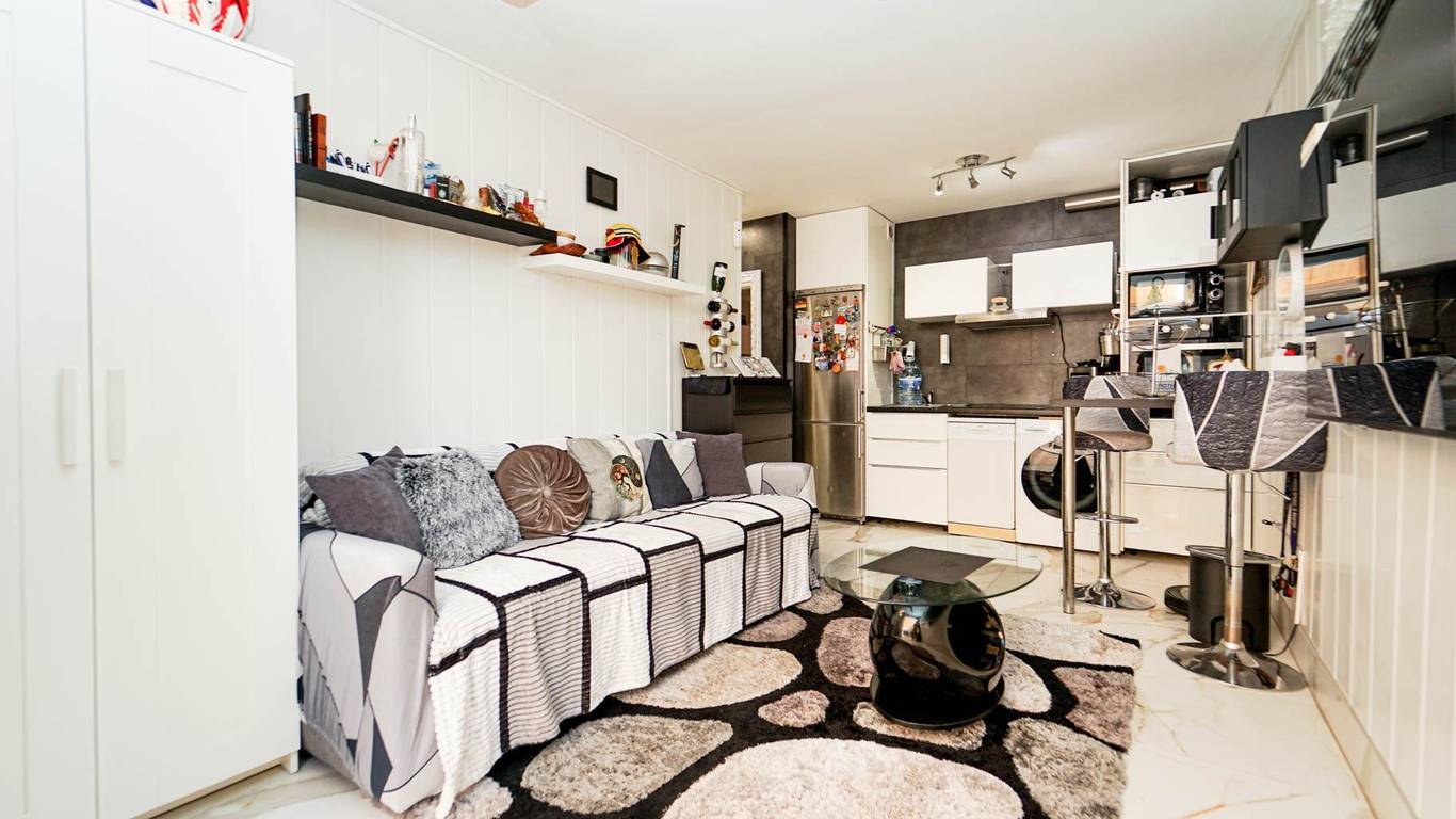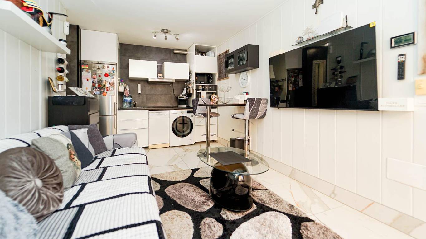 Living room with open-plan kitchen, 1 bedroom, bathroom and terrace.