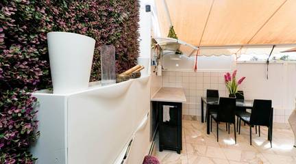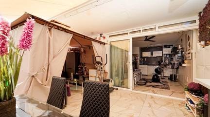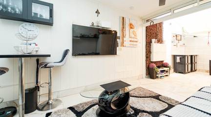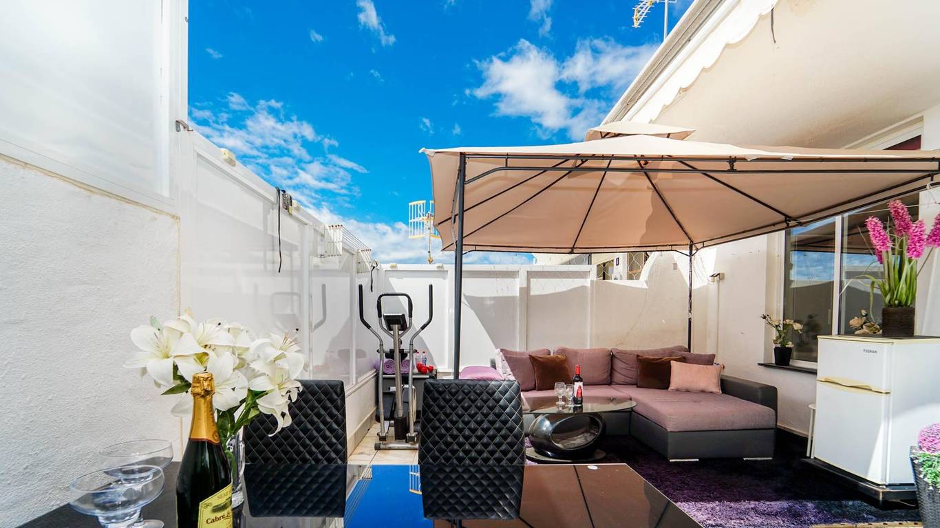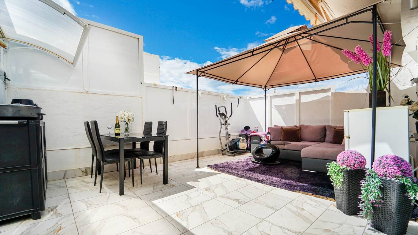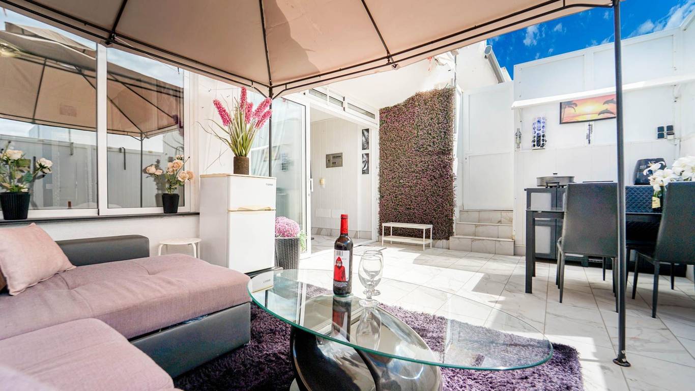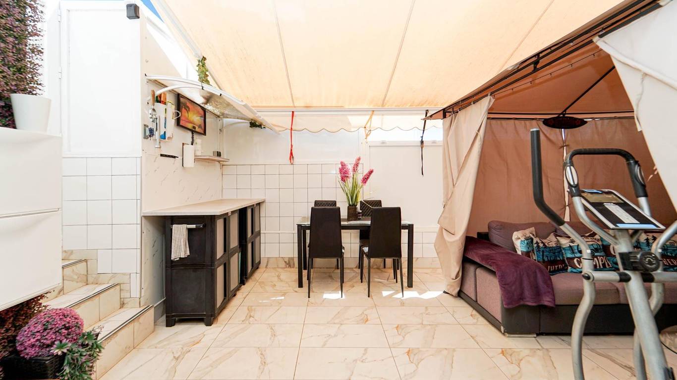 The apartment features a modern kitchen, ceiling fan, awning covering the entire terrace, and an outdoor kitchen, perfect for enjoying the weather.