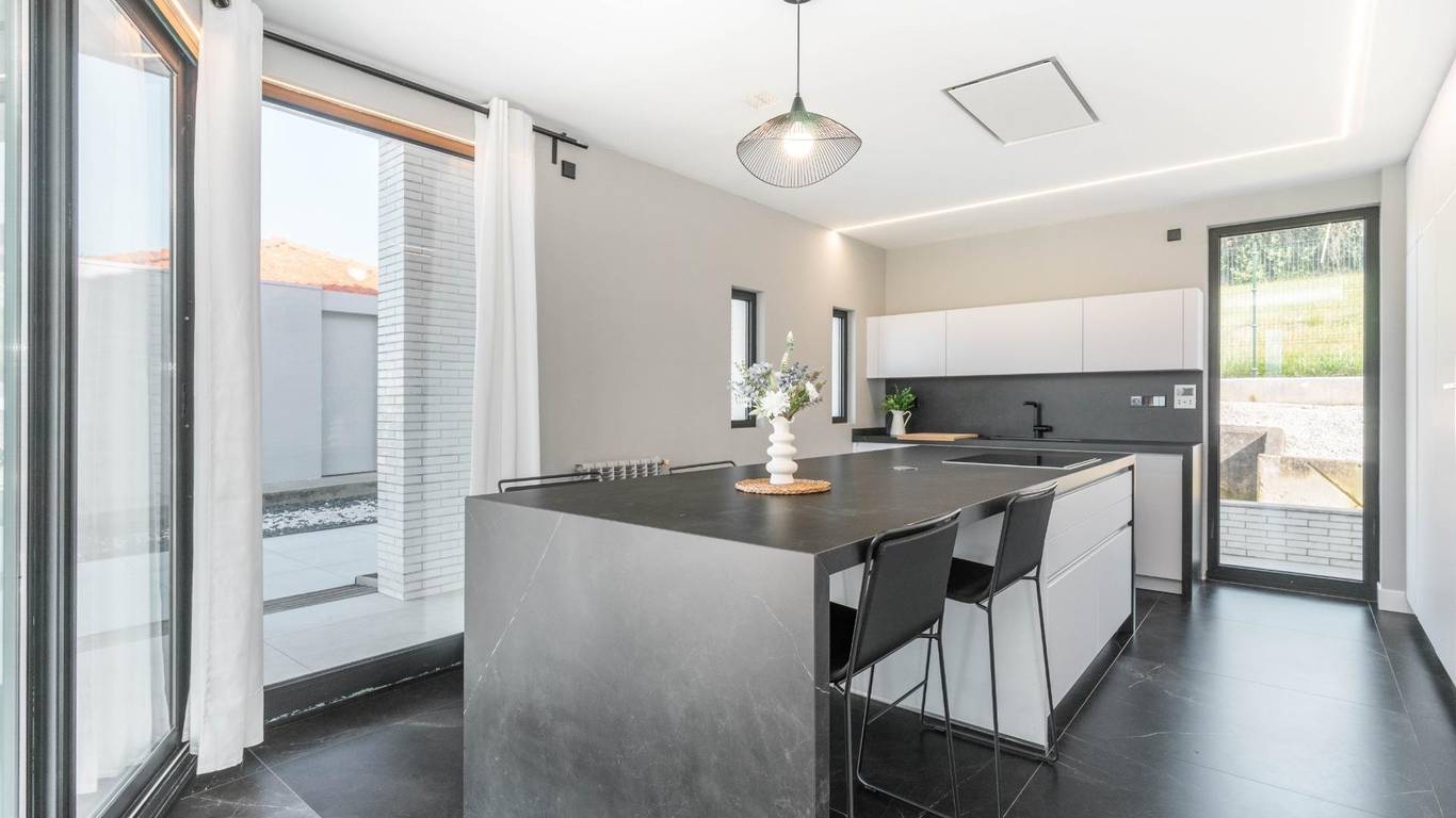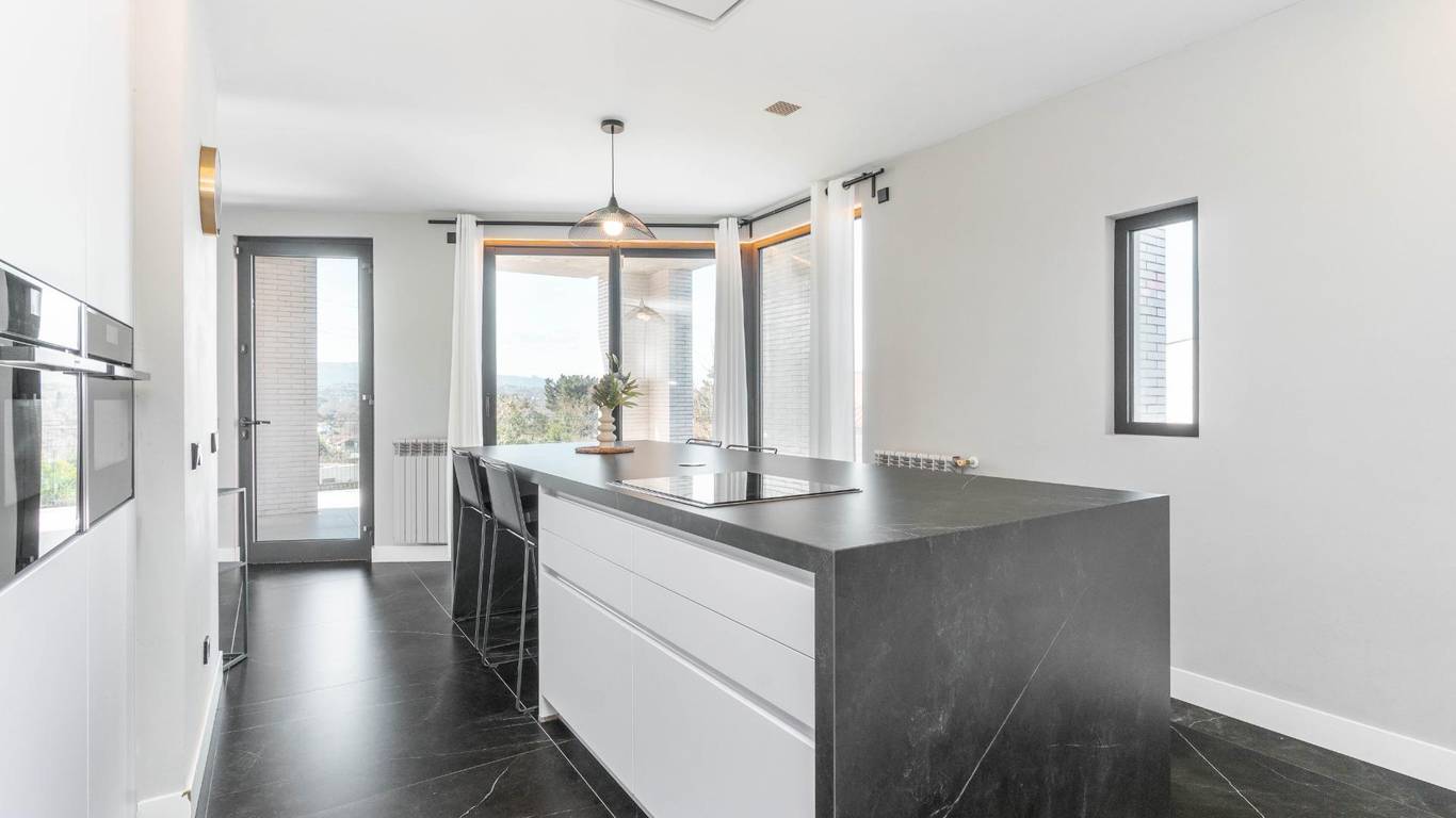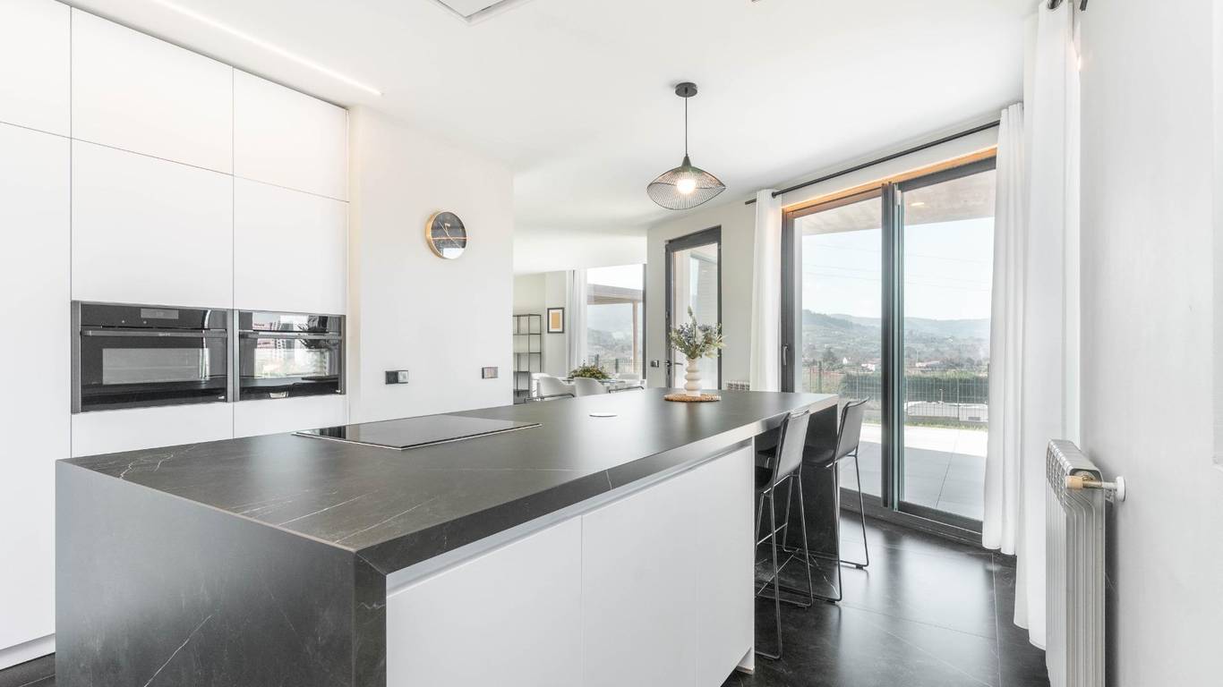 Salón amplio y luminoso con acceso directo al cenador y al jardín, con vistas abiertas hacia Gijón. Cocina moderna con gran isla central, electrodomésticos Neff integrados y trituradora incorporada en el fregadero. Aseo de cortesía y estancia adicional con uso flexible como lavandería o habitación.