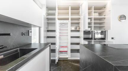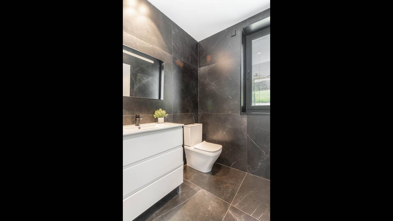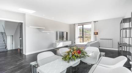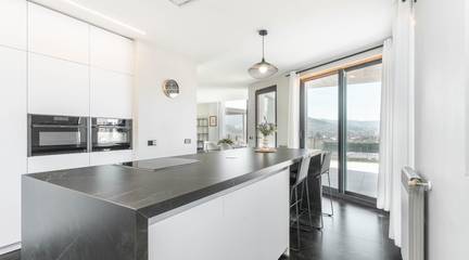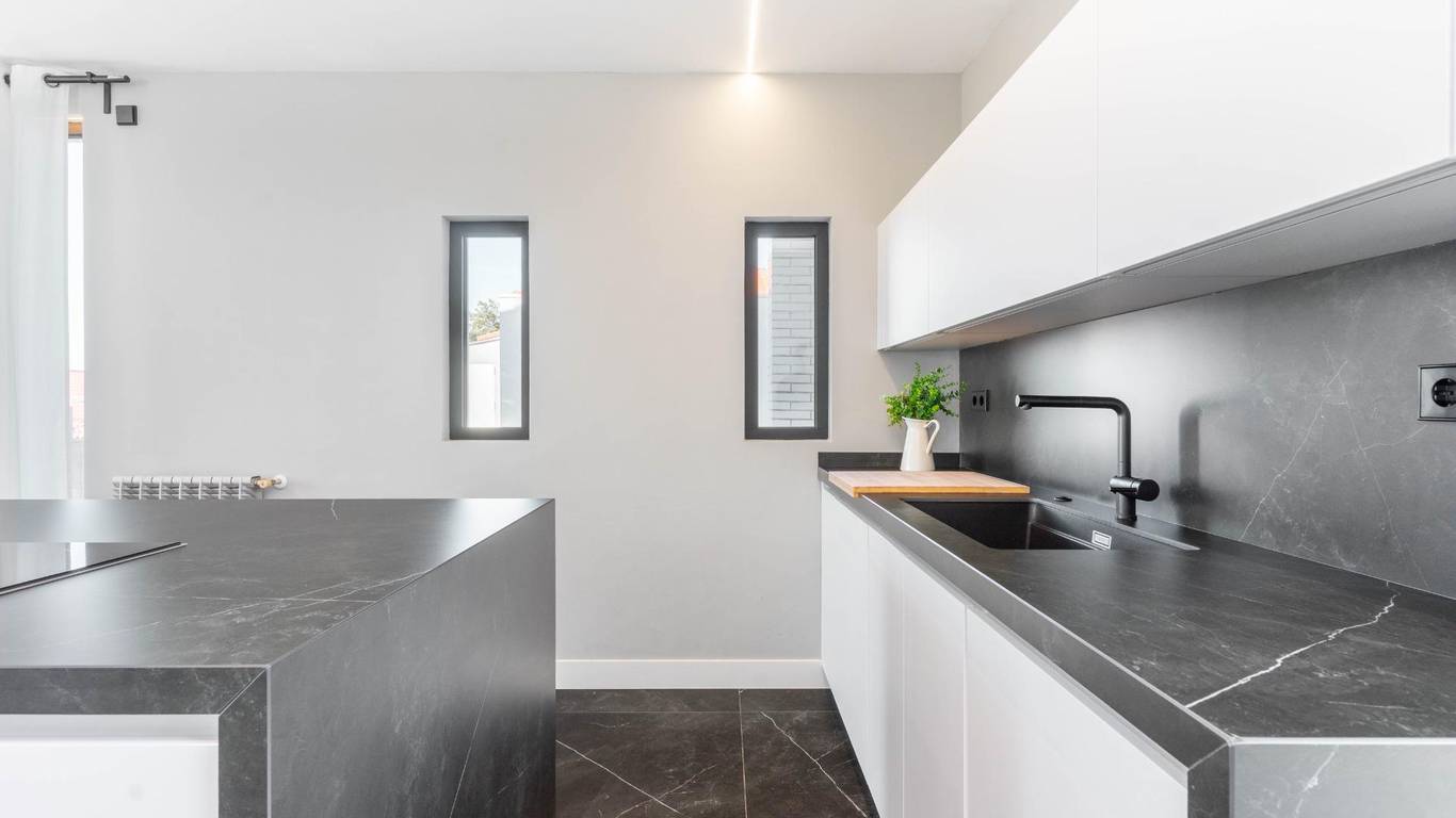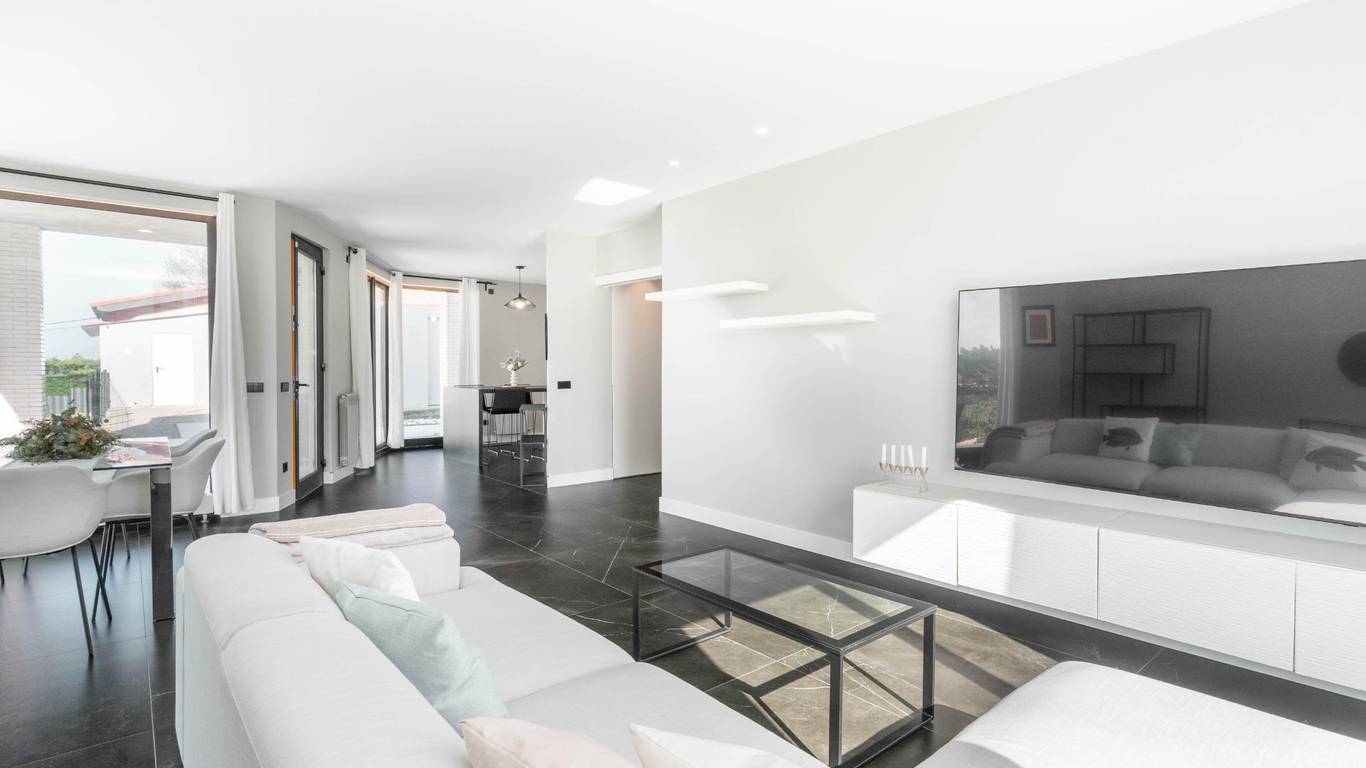 Salón amplio y luminoso con acceso directo al cenador y al jardín, con vistas abiertas hacia Gijón. Cocina moderna con gran isla central, electrodomésticos Neff integrados y trituradora incorporada en el fregadero. Aseo de cortesía y estancia adicional con uso flexible como lavandería o habitación.