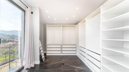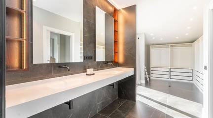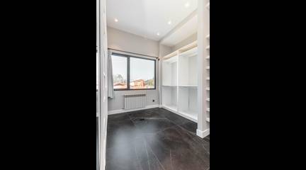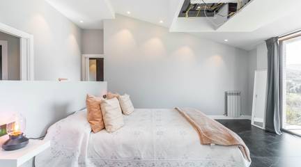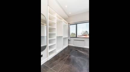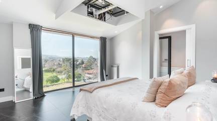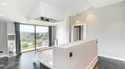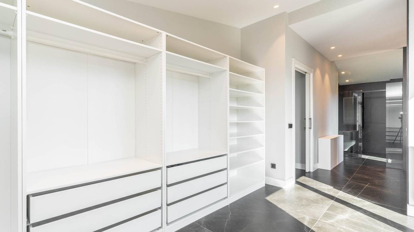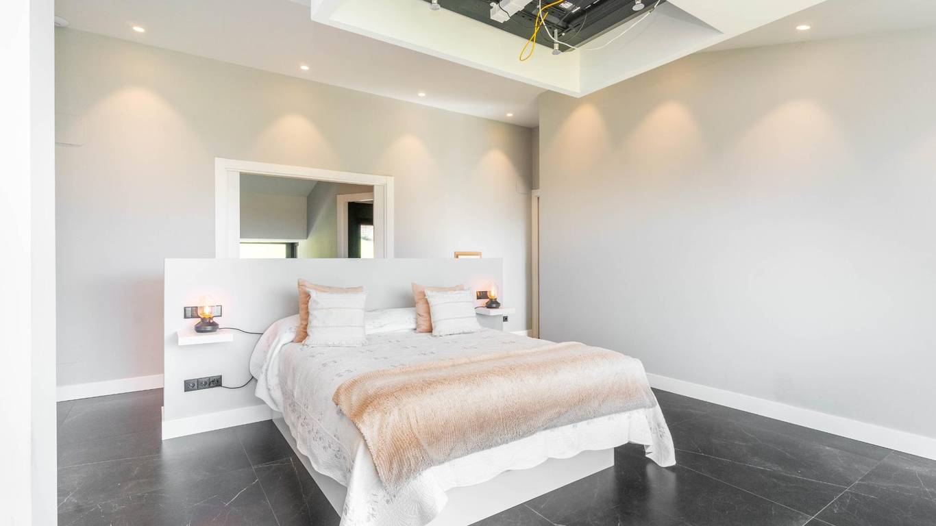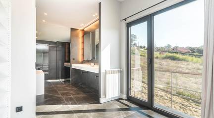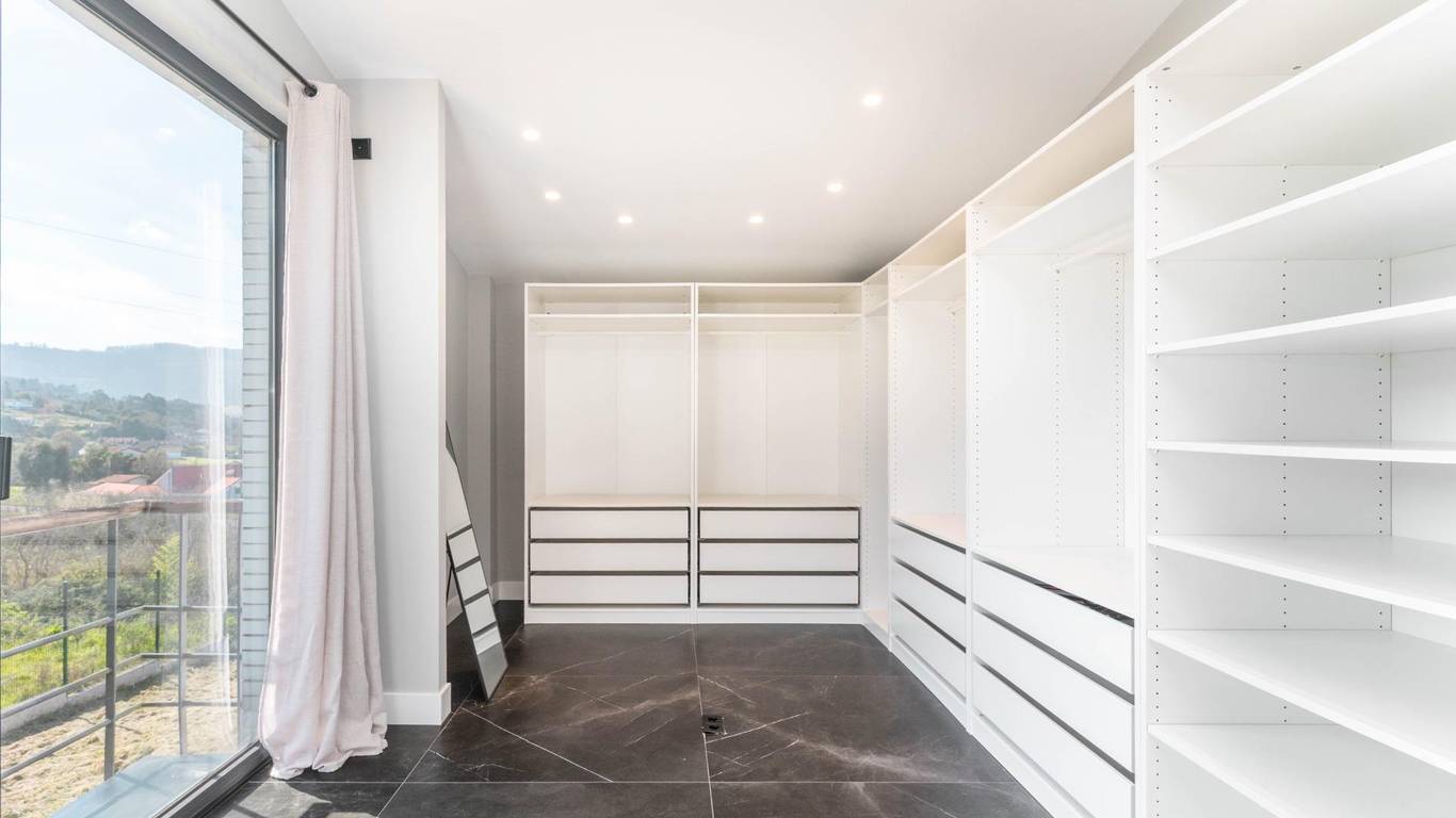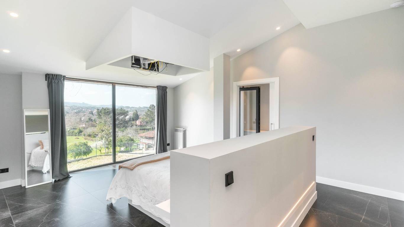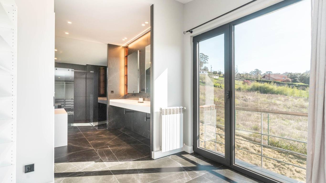 Suite principal con gran ventanal y vistas abiertas, vestidor independiente y baño en suite con zona de vestidor adicional.