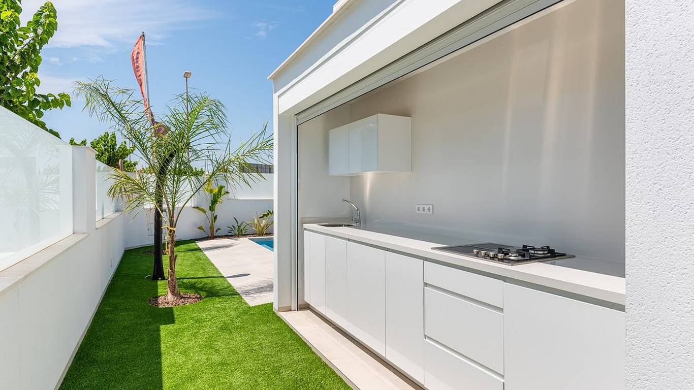 The properties comprise three double bedrooms (all with fitted wardrobes), two bathrooms (en-suite to the master bedroom) and a toilet, a fully equipped modern kitchen (with breakfast bar) and an open plan living/dining area, leading to the spacious tiled garden and private swimming pool.