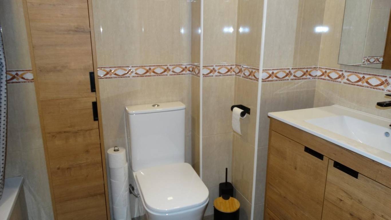 The apartment has 2 bedrooms (one double and one single), 2 full bathrooms (one with a shower and the other with a bathtub), and a practical and functional open-plan kitchen-living-dining area.