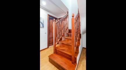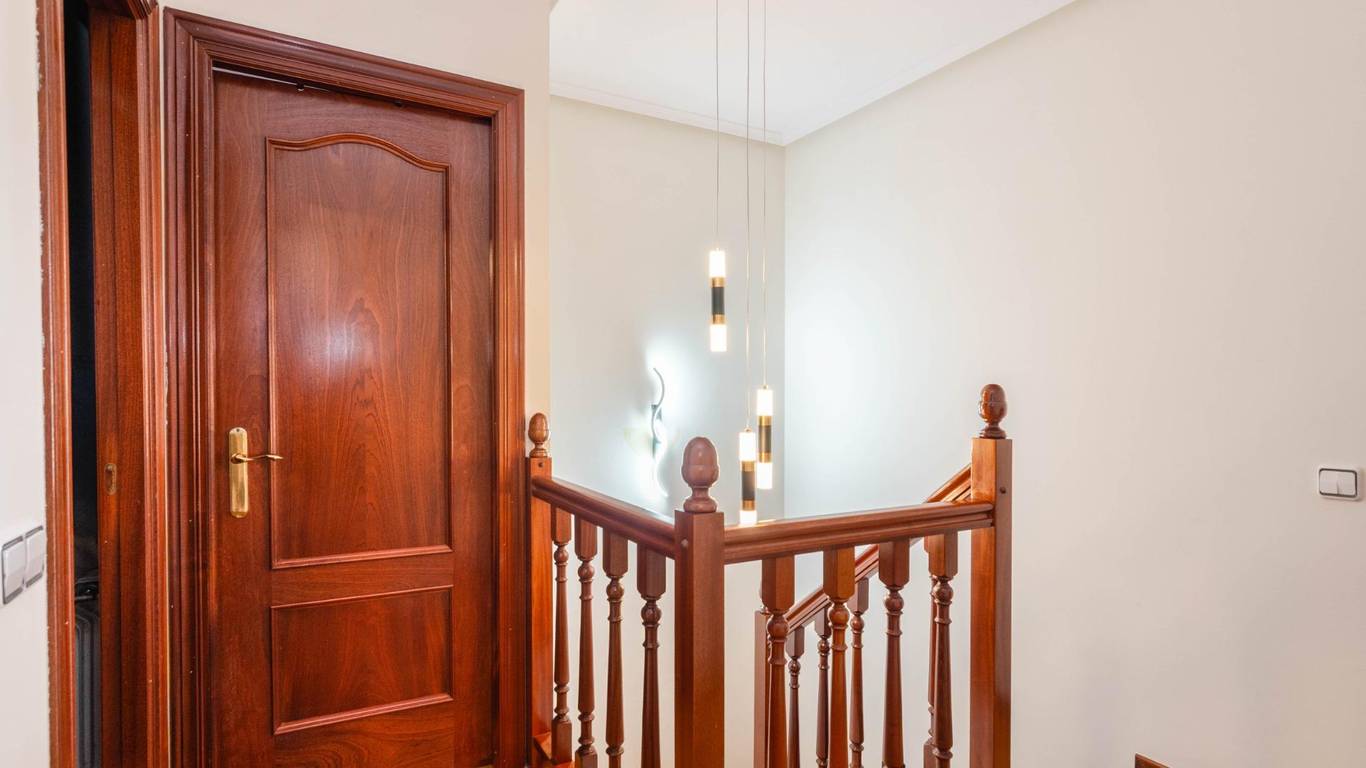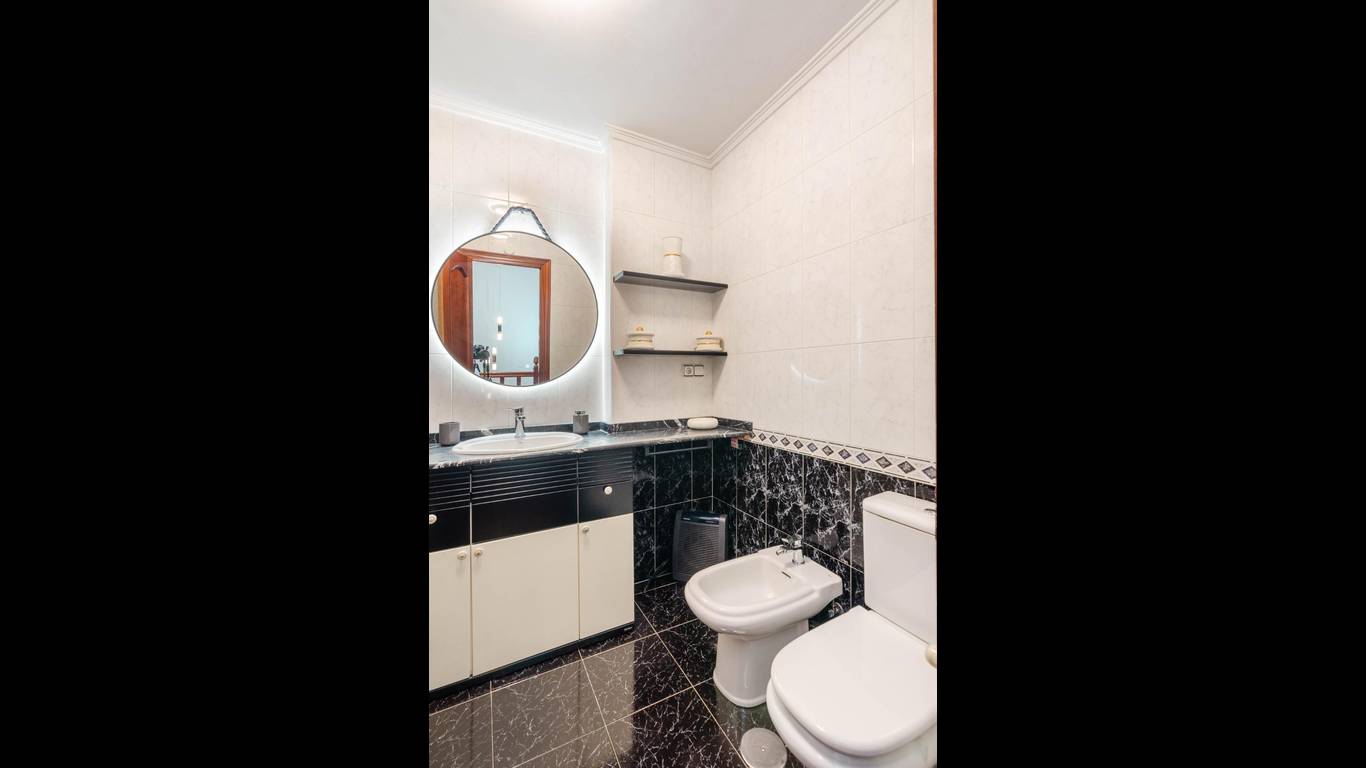 Planta superior: dos dormitorios con armarios empotrados, baño con bañera de hidromasaje y dos balcones.