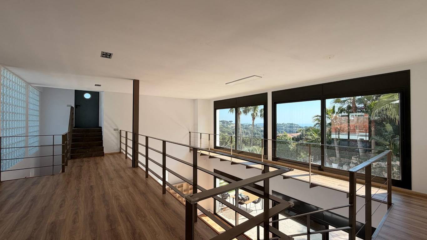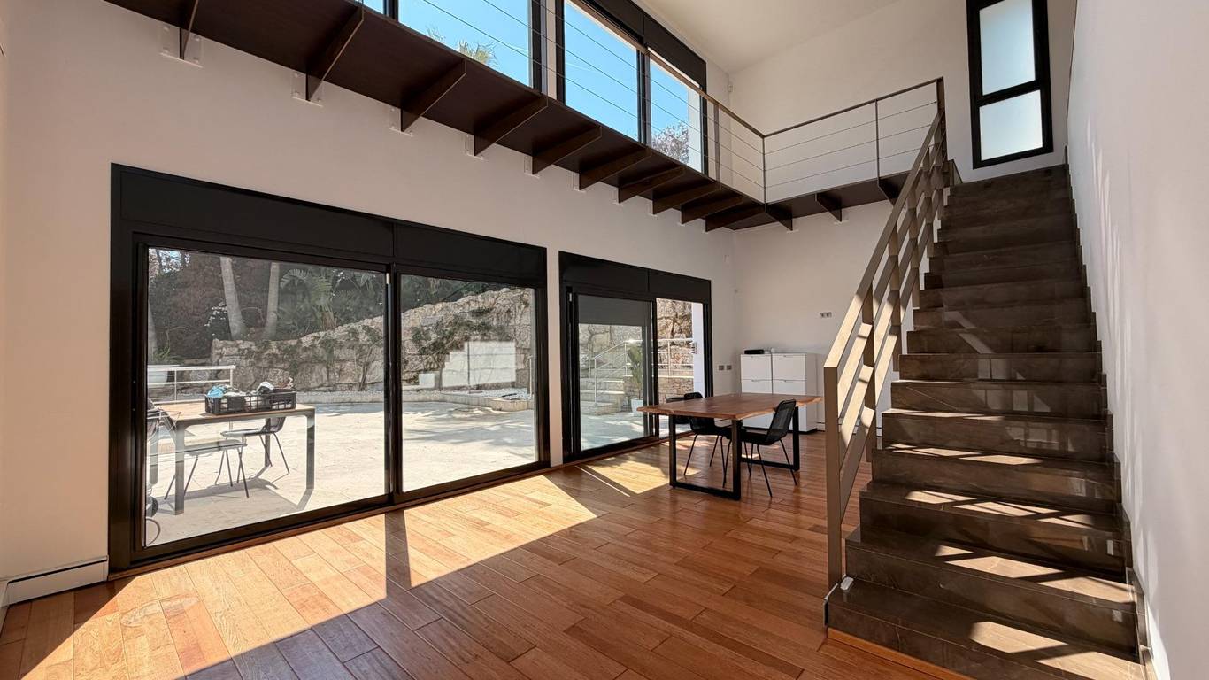 From the main living room, an elegant staircase leads to a second living room on the upper floor, which offers access to an uncovered terrace with panoramic views of the Mediterranean Sea, creating a perfect setting for relaxing and contemplating the scenery.