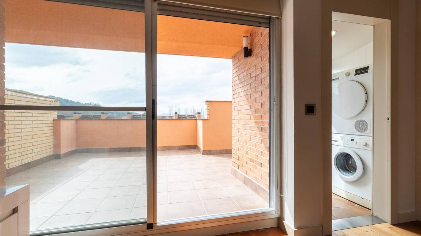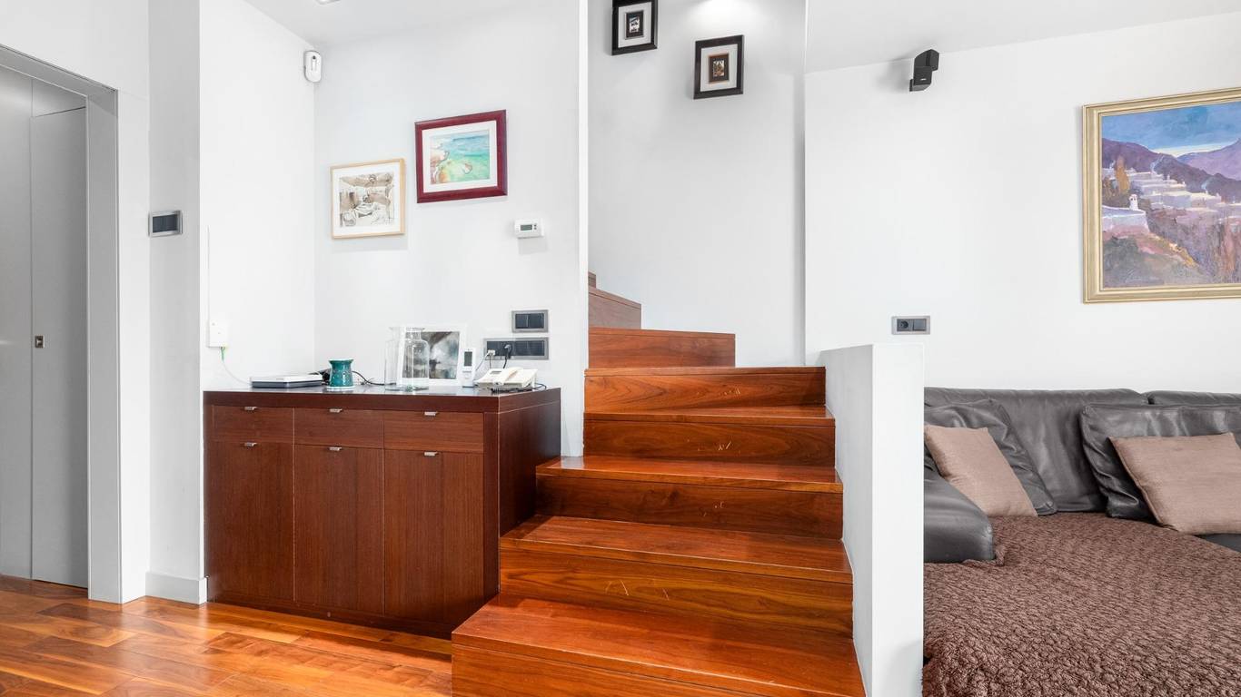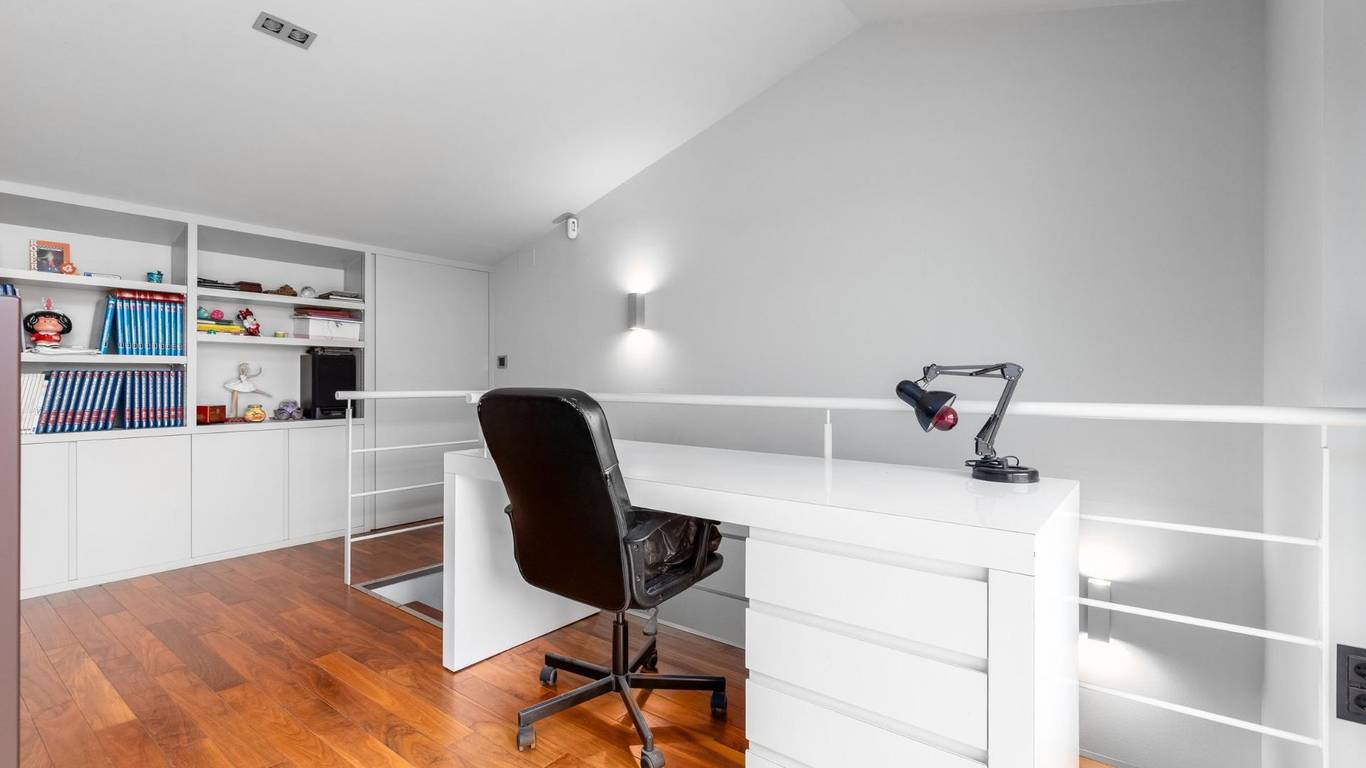 Planta segunda: Actualmente es una zona de estudio diseñado con muchísimo gusto y con materiales de primera calidad en maderas lacadas a medida. Esta zona alta de la vivienda es un espacio diáfano muy versátil para adaptarse a tus necesidades. En esta planta se encuentra la zona de lavadero. y una terraza solárium con vistas despejadas a zona de piscina.