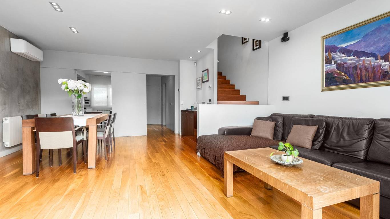 Sus acabados de alta gama marcan la diferencia: suelos de parqué natural, persianas motorizadas, armarios a medida e iluminación LED. Para garantizar el confort climático todo el año, cuenta con aire acondicionado y bomba de calor en sus tres plantas. Una conexión fluida entre el interior y sus múltiples espacios exteriores la convierte en el lugar ideal para disfrutar en familia, a un paso de la capital.