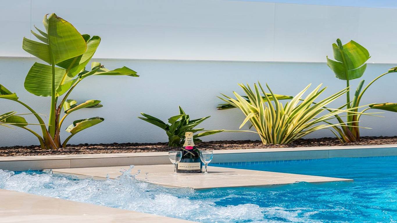 The properties comprise three double bedrooms (all with fitted wardrobes), two bathrooms (en-suite to the master bedroom) and a toilet, a fully equipped modern kitchen (with breakfast bar) and an open plan living/dining area, leading to the spacious tiled garden and private swimming pool.