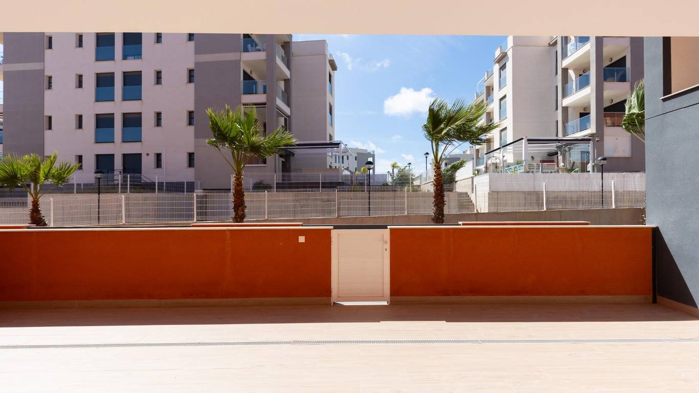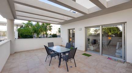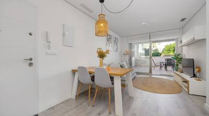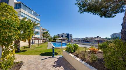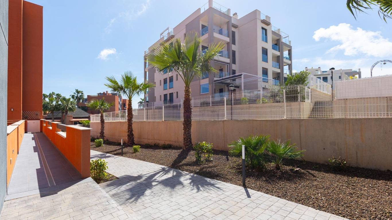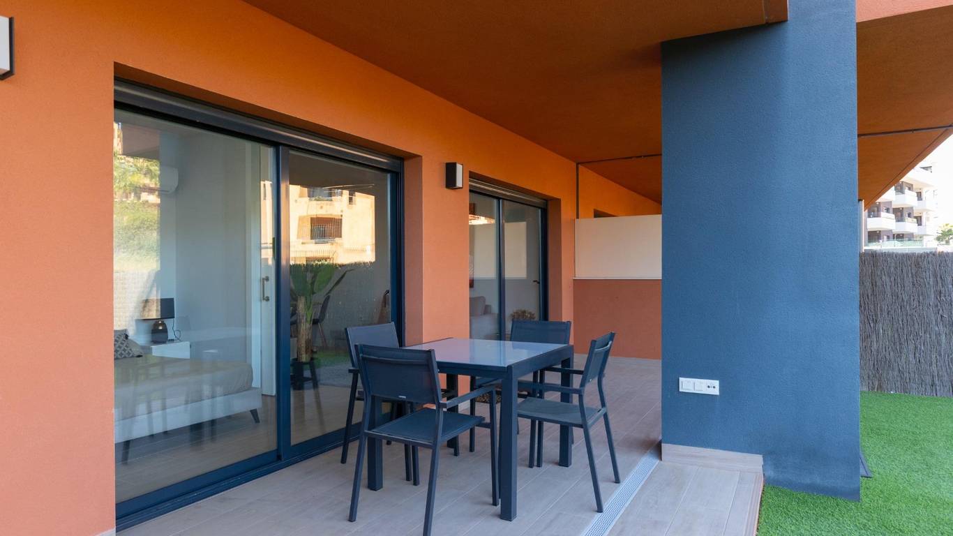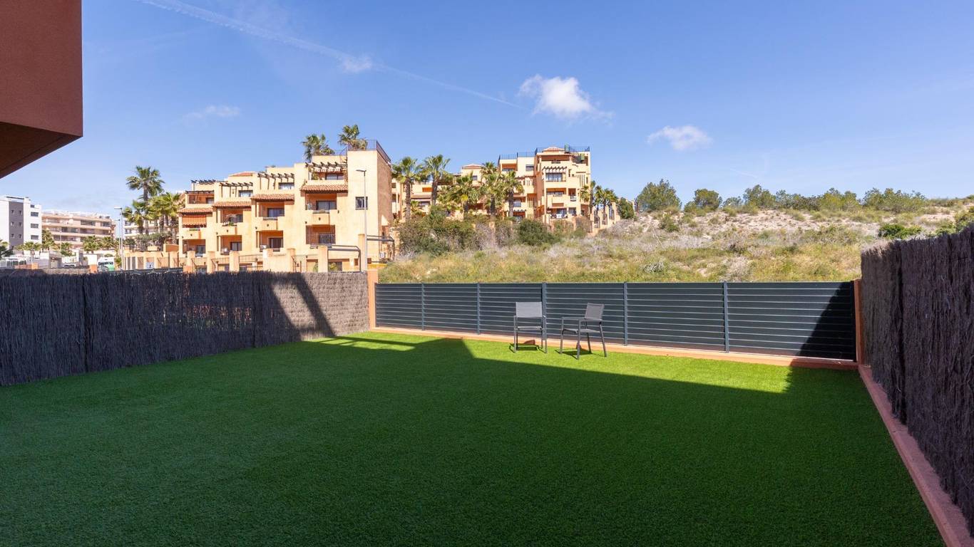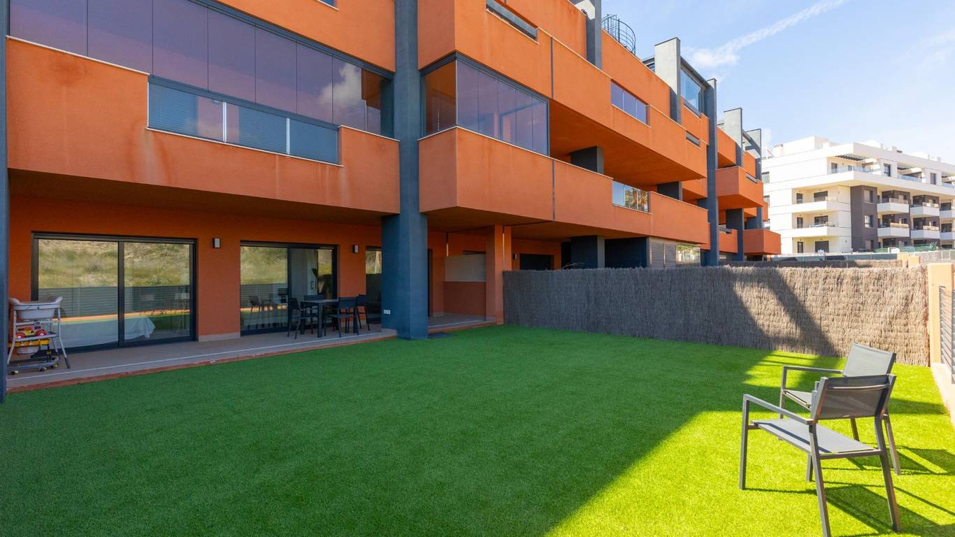 Discover this exceptional ground-floor apartment located in the prestigious Palapagolf II Residential in Orihuela Costa. Combining spacious interiors, generous outdoor areas, and an unbeatable location, this property is perfect for those seeking a serene Mediterranean lifestyle.Set just a few meters from the renowned Villamartín Golf, the home offers immediate access to one of the most sought-after golf courses in the region. Everyday convenience is guaranteed, with a wide range of shops, restaurants, and services nearby, and the famous La Zenia Boulevard only 10 minutes away by car. The stunning Playa de La Zenia is within 5 km, offering sun, sand, and sea just a short drive from your door. Property Features2 spacious bedrooms with direct access to the front garden2 fully equipped bathrooms, perfect for family or guestsGenerous private front plot facing the living room and bedrooms, ideal for outdoor dining, relaxing, or enjoying the Mediterranean sunAdditional terrace at the entrance, perfect as a lounge or welcome areaDual orientation:Main terrace facing East, enjoying the morning sunEntrance terrace facing West, perfect for sunsetsCommunal swimming pool for relaxation and recreationGarage included, providing security and convenienceFully furnished and equipped, move-in ready Lifestyle BenefitsBuilt in 2022, the complex is meticulously maintained, offering a modern, well-kept appearance that feels almost brand-new. The residence provides a peaceful and secure environment, with beautifully landscaped communal areas and a strong sense of community.This property is an ideal choice for permanent residence, a second home, or a long-term investment. Enjoy the tranquility of a prestigious golf community, the convenience of nearby shopping and services, and the sun-soaked Mediterranean lifestyle, all just minutes from the coast.The price of the property does not include notary and property registration fees (which are subject to tariffs and vary depending on the deed price), nor taxes (which in the Valencian Community vary depending on the price of the property and the personal characteristics of the buyer).