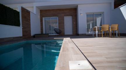 NEW BUILD TOWNHOUSES IN SAN JAVIER New Build luxury complex of 24 one level villas or on 2 floors with private pool, terraced area and solarium with Summer kitchen that allows you to enjoy all hours of sunshine, every day of the year. Each villa has 2 or 3 bedrooms and 2 fitted bathrooms on one level or 3 bedrooms and 3 fitted bathrooms on two levels. Designed with a contemporary style and open planned concept, comprising a fully-fitted kitchen and lounge-dining room. The development is located in San Javier (Murcia), near the beach, surrounded by services, parks, sports facilities and several Golf Courses. The property will meet the highest standards and will be equipped with: Private swimming pool with shower. Kitchen completely furnished and equipped with oven, microwave, fridge, integrated dishwasher, hob and extractor fan. Lighting: inside the property (dining room, kitchen, corridors and bathrooms) as well as in outdoor areas. Lined wardrobes with drawers. Fully fitted bathrooms with toilet, vanity unit, mirror and shower with screen panels. Pre-installation for ducted air conditioning. Solarium with Summer kitchen. Parking space on the plot. San Javier is close to all amenities with easy access to the beach, water sports, shops and the transport network. Here you can enjoy all of the facilities that San Javier has to offer such as the local shops, bars and restaurants as well as being near to shopping centres, the airport of Murcia and all of the beautiful places to be found along the Mar Menor. Corvera/Murcia airport is 30 minutes away and Alicante airport is 45 minutes away.