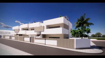 New Build Bungalows for Sale in Pilar de la Horadada 3 km from BeachBoutique Residential Development in Pilar de la HoradadaDiscover this exclusive new build residential complex of modern bungalows located in Pilar de la Horadada, the southernmost town of the Costa Blanca. This boutique project consists of only 14 carefully designed homes with 2 or 3 bedrooms and 2 bathrooms, offering an ideal combination of comfort, style and Mediterranean lifestyle.The development is situated in a quiet residential area within walking distance of the town center, allowing residents to enjoy easy access to shops, restaurants, supermarkets and essential services. Pilar de la Horadada is known for its welcoming atmosphere, traditional Spanish charm and lively main street filled with cafes, boutiques and charming squares.Modern Bungalows with Private Outdoor SpacesThe homes have been designed to offer bright interiors and functional layouts, perfect for both permanent living and holiday use.Ground floor bungalows feature a private garden and private swimming pool, creating the perfect setting to enjoy outdoor living, sunbathing or entertaining family and friends.Top floor bungalows include a spacious terrace and a private rooftop solarium. The solarium comes with a summer kitchen and offers the option to add a private pool or jacuzzi at an extra cost, making it an ideal space to relax while enjoying the warm Mediterranean climate and open views.Each property includes a private parking space within the residential complex for added convenience.Quality Construction and Modern FeaturesThese new build homes are built with quality materials and modern installations designed to ensure comfort and energy efficiency throughout the year.Aluminum exterior carpentry with thermal breakFully fitted kitchens with included appliancesBathrooms equipped with mirrors and shower screensInterior and exterior LED lightingHot water system with energy efficient aerothermal technologyPre installation for ducted air conditioningThe combination of modern design and practical features makes these homes an excellent option for buyers looking for a contemporary property on the Costa Blanca.Excellent Location Close to Beaches and GolfPilar de la Horadada enjoys a strategic location close to some of the best beaches and golf courses in the region.Torre de la Horadada beach 3 kmMil Palmeras beach 3 kmLo Romero Golf 6 kmRegion de Murcia International Airport 45 kmAlicante Elche Airport 75 kmThe area also offers excellent road connections to nearby coastal towns, marinas and leisure facilities, making it a perfect base to explore the Costa Blanca and Costa Calida.Find Your New Home on the Costa BlancaIf you are looking for a modern new build bungalow near the beach with excellent amenities and a fantastic location, this residential development in Pilar de la Horadada is an outstanding opportunity. Contact us today for more information or to schedule a visit.