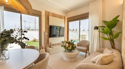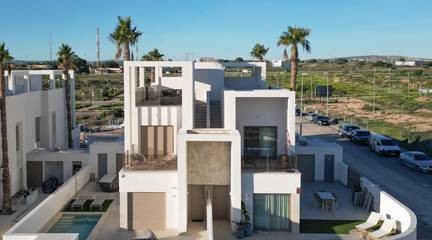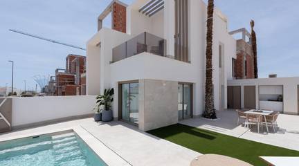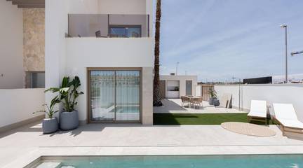 New Build Villas with Private Pool at Serena Golf-Los AlcazaresBoutique Collection of Modern Homes Near the SeaDiscover an exclusive boutique development of 37 modern quad and semidetached style villas located at La Serena Golf in Los Alcazares on the beautiful Costa Calida. These contemporary homes are designed for buyers seeking privacy, sunshine and an outdoor lifestyle just 300 meters from the warm waters of the Mar Menor.Los Alcazares is a charming coastal town known for its long promenade, sandy beaches and relaxed Mediterranean atmosphere. The area enjoys more than 300 days of sunshine per year and offers excellent restaurants, shops, marinas and sports facilities. Its location between the sea and the golf course makes it one of the most desirable destinations in the region for both permanent living and holiday homes.Modern Villas with Private Pool and Outdoor LivingEach property features a private plot with its own swimming pool, creating the perfect environment to enjoy the Mediterranean climate throughout the year. The homes include 3 bedrooms and 2 or 3 bathrooms plus guest toilets, offering comfortable and functional living spaces ideal for families or guests.The villas are designed to emphasize outdoor living. Next to the pool there is a barbecue area and an exterior guest toilet, perfect for entertaining friends and family. The rooftop solarium offers additional space to relax in the sun and includes a solar shower with pre installation for a jacuzzi and summer kitchen.Parking is included both within the private plot and with an assigned underground parking space.High Quality Finishes and Modern FeaturesThe homes are built with modern materials and quality specifications designed for comfort and style.Fully equipped kitchen with appliances in white glass finishBathrooms with backlit mirrors, shower screens and vanity unitsMotorized window shuttersBasic lighting packageFully installed ducted air conditioningThese features ensure a comfortable living experience whether the property is used as a main residence or holiday home.Resort Style Amenities and Excellent LocationOwners also enjoy access to shared resort style facilities with a neighboring development. These amenities include landscaped gardens, a lagoon style communal pool, spa area, gym and sauna.The location offers easy access to beaches, golf courses and nearby cities.Mar Menor beach 0.3 kmLa Serena Golf next to the developmentLos Alcazares town center 2 kmCartagena 22 kmMurcia 40 kmRegion de Murcia International Airport 30 kmAlicante Elche Airport 90 kmThe shallow waters of the Mar Menor are perfect for swimming, sailing, paddle surfing and other water sports all year round.Secure Your Mediterranean Lifestyle in Los AlcazaresThese new build villas offer the perfect combination of beach, golf and modern comfort on the Costa Calida. Contact us today to receive more information or arrange a visit and secure your new home at Serena Golf in Los Alcazares.