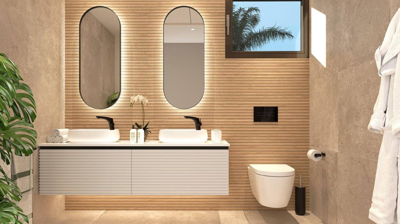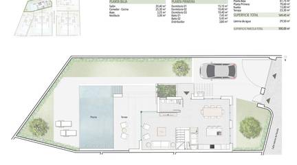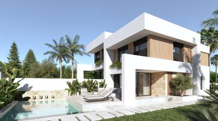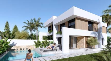 Modern Semi Detached Villas with Private Pool in Las Filipinas-Orihuela CostaExclusive New Build Villas in a Prime Costa Blanca LocationDiscover this boutique development of eight modern semi detached villas located in Las Filipinas, Orihuela Costa, one of the most sought after residential areas in the southern Costa Blanca. This well established neighborhood offers excellent access to everyday amenities including supermarkets, restaurants, pharmacies and leisure facilities, all within a short distance.Ideally positioned between some of the best golf courses in the area, including Villamartin Golf, Campoamor Golf, Las Ramblas Golf and Las Colinas Golf, these villas provide an exceptional lifestyle for golf lovers and international buyers. The beautiful beaches of Orihuela Costa are just 6 km away, making this an ideal location for both permanent living and holiday homes.Contemporary Design with Spacious LayoutsEach villa is built on a private plot of approximately 300 m2 and offers around 140 m2 of modern living space distributed over two floors. The properties feature three double bedrooms, two full bathrooms with double sinks including an en suite, and an additional guest toilet.The ground floor showcases a bright and stylish living area with a feature wall finished in natural stone, creating a warm and elegant atmosphere. Large windows provide direct access to the outdoor terrace and private swimming pool, which includes decorative water features.At the rear of the property, a designer Italian kitchen with a central island and LED lighting opens to a spacious dining area with access to the garden and private parking area.Elegant Bedrooms and Outdoor LivingThe first floor includes two guest bedrooms with built in wardrobes and a family bathroom. The master bedroom stands out with a sophisticated design, featuring a floor to ceiling oak headboard, mirrored details and a luxurious en suite bathroom, as well as views over the pool area.There is also the option to add a rooftop solarium or a semi basement, offering additional space and customization potential.High Quality Features and Modern ComfortThese villas are built with high quality materials and the latest technology to ensure comfort and efficiency. Features include pre installation for ducted air conditioning, aerothermal system for hot water, underfloor heating in bathrooms and electric shutters.Additional specifications include an alarm system, video intercom and automated vehicle access gate, ensuring both convenience and security.Prime Location Close to Beaches and GolfLas Filipinas offers a strategic location with excellent connectivity. The beaches of Orihuela Costa are approximately 6 km away, while Murcia International Airport is 50 km and Alicante Airport is 55 km. Several top golf courses are located within a radius of 2 to 5 km.Ideal Investment Opportunity on the Costa BlancaThese modern villas offer a perfect combination of design, location and lifestyle, making them an excellent investment or second home on the Costa Blanca.Contact us today for more information or to arrange a viewing and secure your new villa in Orihuela Costa.