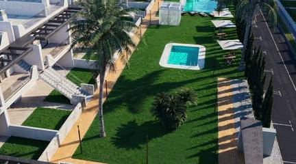 New Build Bungalows with Garden or Solarium Near the Beach in Pilar de la HoradadaModern Mediterranean Homes Designed for ComfortDiscover this exclusive new build residential complex in Pilar de la Horadada, offering contemporary bungalows located less than 2 km from the beach. Designed to combine comfort, style and functionality, these homes are ideal for year round living, holidays or as a smart investment on the Costa Blanca.The development offers a choice between ground floor bungalows with private gardens and top floor bungalows with private rooftop solariums. Each property is thoughtfully designed to maximize outdoor living and make the most of the Mediterranean climate.Spacious 2 Bedroom Properties with High Quality FinishesEach bungalow features 2 bedrooms and 2 bathrooms, one of them ensuite, along with a private parking space in the underground garage. The homes are built with quality materials and modern finishes that ensure energy efficiency and durability.Key features include:Preinstallation for ducted air conditioningAluminium exterior carpentry with double glazing and motorized shuttersSecurity entrance door for peace of mindAerothermal system for efficient hot water productionBuilt in wardrobes in all bedroomsFully equipped bathrooms with furniture and shower screensThese specifications provide a comfortable and practical home suitable for all seasons.Private Community with Pool and Landscaped GardensThe residential complex is private and secure, with beautifully landscaped communal gardens and a large communal swimming pool. This creates a pleasant and relaxing environment where residents can unwind and enjoy the excellent climate.Located just outside the town center, the development allows residents to walk to supermarkets, restaurants, bars, schools and essential services without needing a car.Excellent Location Close to Beaches and ServicesPilar de la Horadada is a charming Spanish town in the southernmost part of the Costa Blanca, known for its lively atmosphere, local shops, traditional squares and friendly community.The sandy beaches of Torre de la Horadada Beach and Mil Palmeras Beach are just 2 km away, offering fine golden sand, a scenic promenade and a marina. The area is also ideal for cycling, walking and outdoor sports.Distances to Key Points of InterestLo Romero Golf 5 kmLa Zenia Boulevard 15 kmMurcia Corvera Airport 40 kmAlicante Airport 55 kmTorre de la Horadada Marina 3 kmReserve Your New Home TodayDo not miss this opportunity to own a brand new bungalow near the beach in one of the most desirable areas of the Costa Blanca. Contact us today for more information and to arrange a visit.