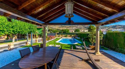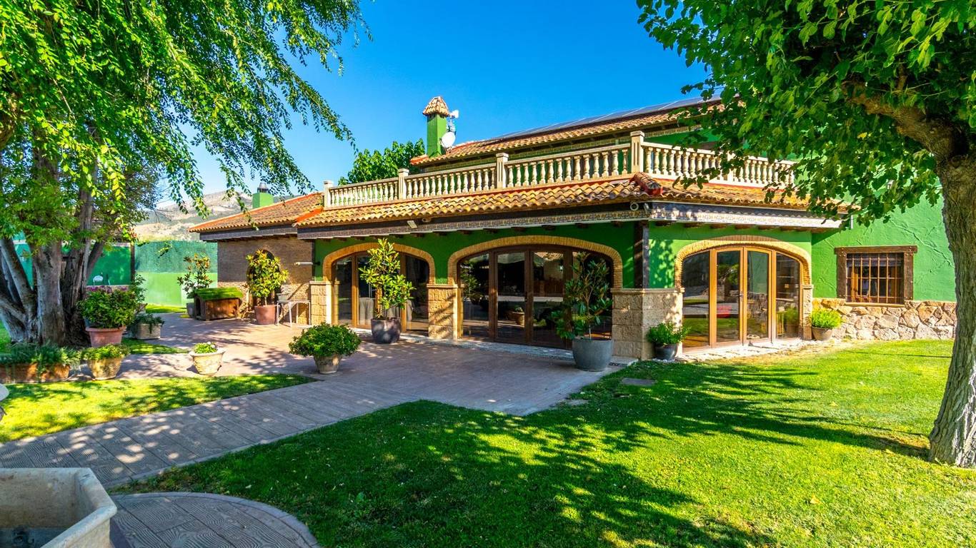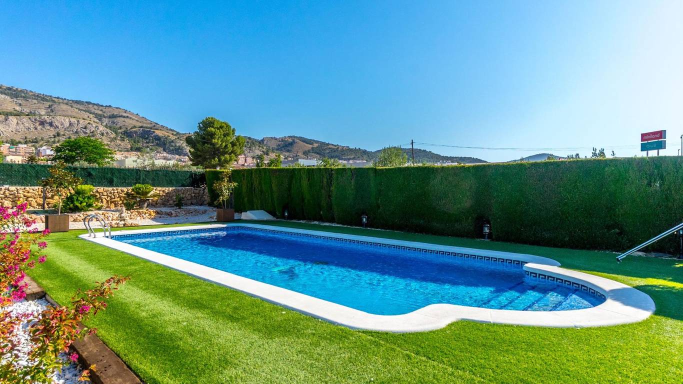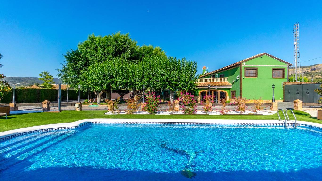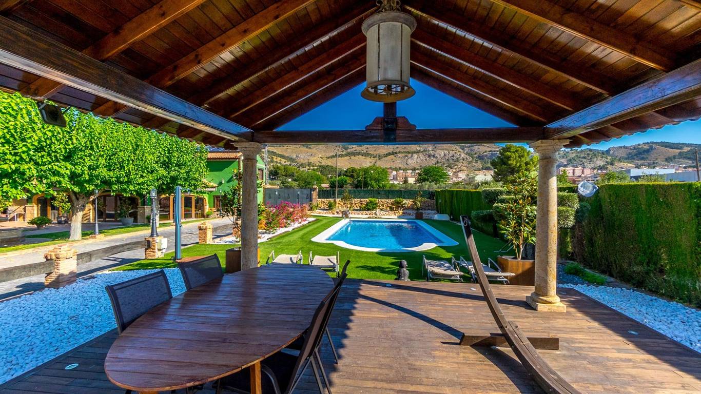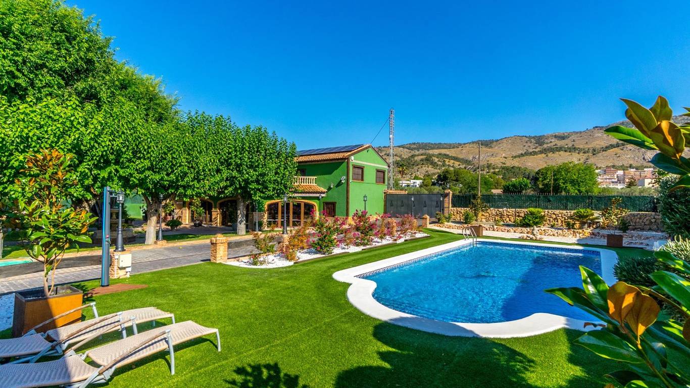 Exclusive chalet in Onil, situated on a 5,968 m plot divided into two distinct zones and fully fenced with security cameras, ideal for those seeking privacy, comfort and versatile outdoor space.RESIDENTIAL AREA (1,700 m)The main house features a large private pool with an elegant built porch and exterior parking for up to 4 vehicles. It also includes two water wells for irrigation, combining convenience and efficiency. The property layout is:GROUND FLOOR: Two living rooms one spacious and bright interior, and one exterior with large windows overlooking the garden, including a built-in barbecue. The interior living room leads to a kitchen with gallery and a full bathroom.UPPER FLOOR: Four bedrooms, two bathrooms and a large terrace with unobstructed views of the surroundings.ORIENTAL GARDEN (4,268 m)A space with personality, featuring wooden pergolas, walking paths, corners decorated with statues, oriental plants and decorative elements. Includes a storage building that can be converted into a guest house or recreational area. Perfect for events, relaxation, or outdoor projects.COMFORT AND EFFICIENCYThe chalet is ready for year-round living, equipped with oil heating and solar panels, combining comfort and sustainability.LOCATIONLess than 700 metres from the centre of Onil, a charming town in the lAlcoià region, known for its toy-making tradition, local festivals and natural surroundings near the mountains. Onil has a Mediterranean climate with mild winters and very rare snow, making it perfect to enjoy the property all year.A unique property for those seeking a home with character, privacy and extensive possibilities for enjoyment.