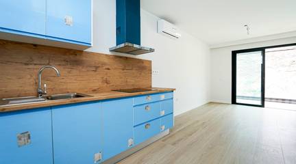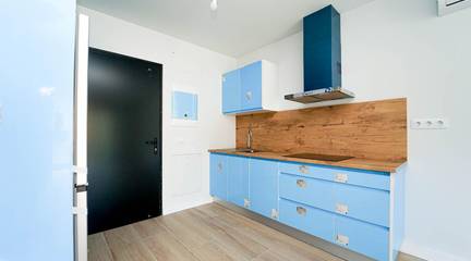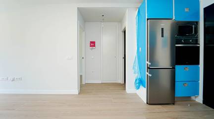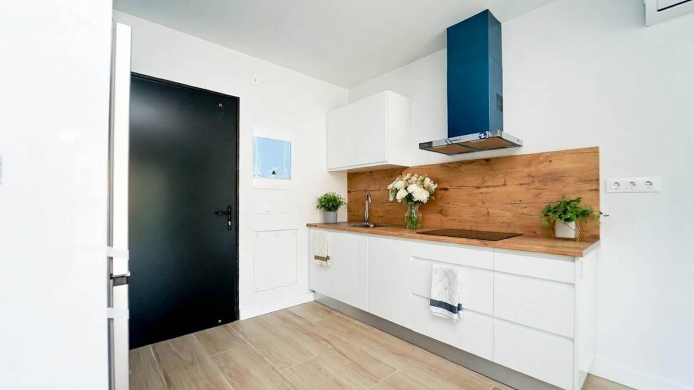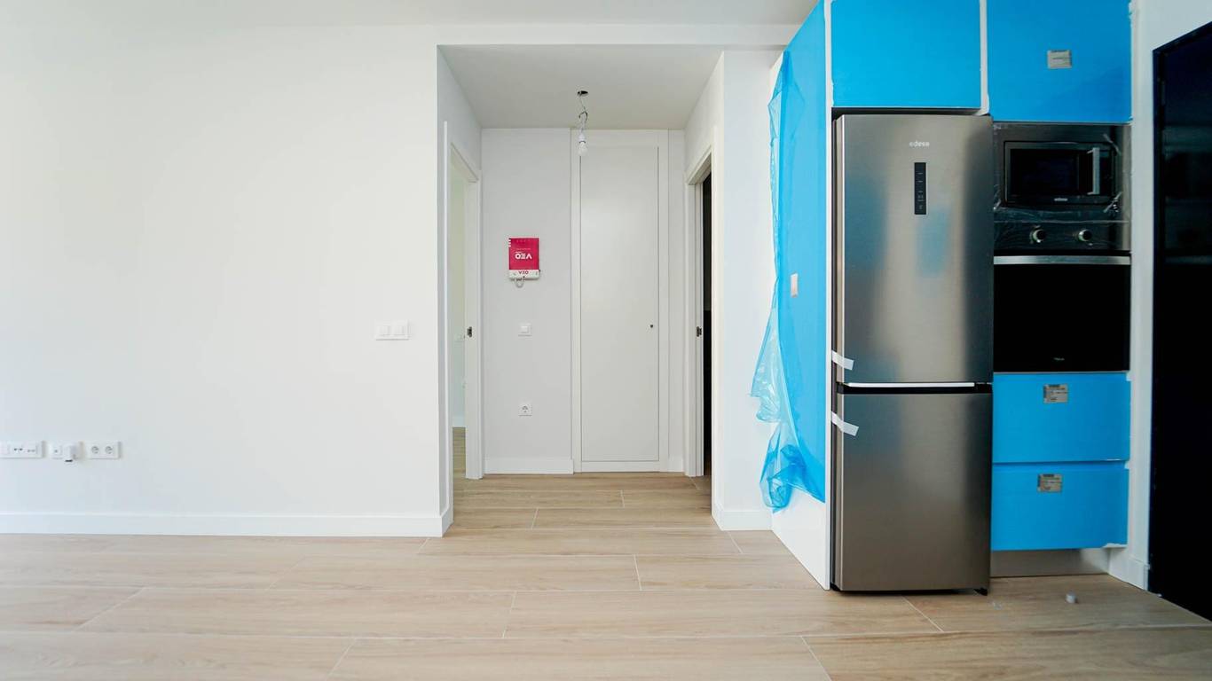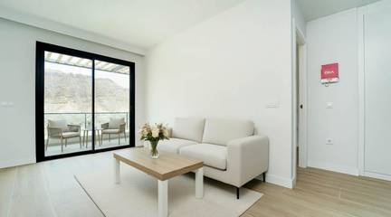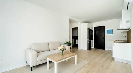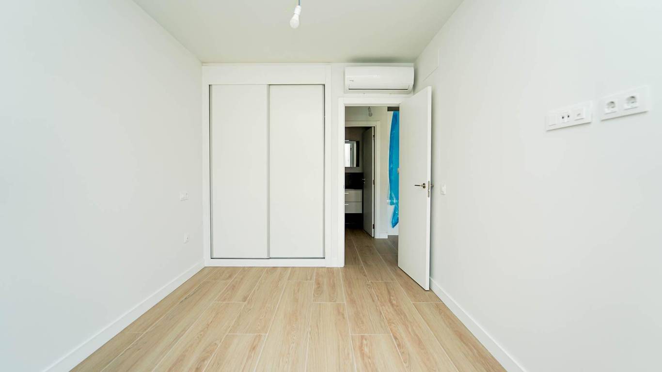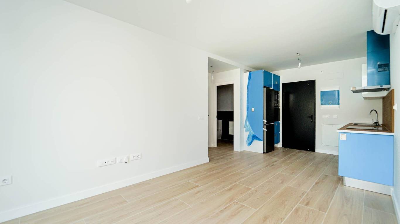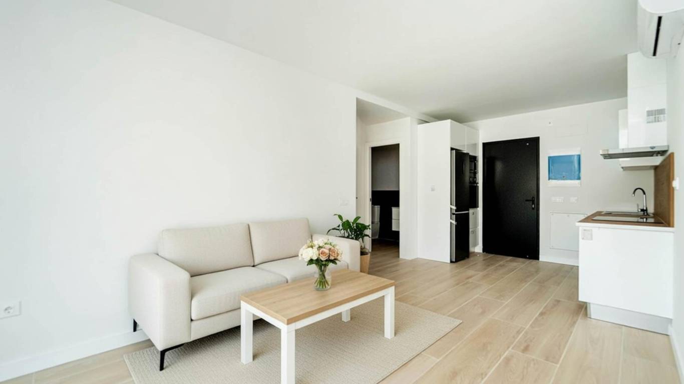 The property has a west-facing orientation, with afternoon sun, and includes two outdoor areas: a private terrace by the entrance and a balcony connected to the living room. The interior features a spacious and bright living room, a bedroom, a fully equipped kitchen, and a full bathroom. Additionally, it is equipped with air conditioning in the living room and bedroom, ensuring a comfortable environment year-round. The property also includes a private parking space and a storage room located in front of the apartment, making daily use and storage convenient.