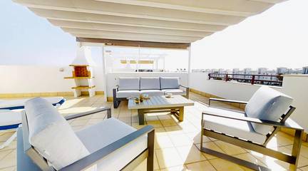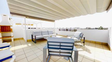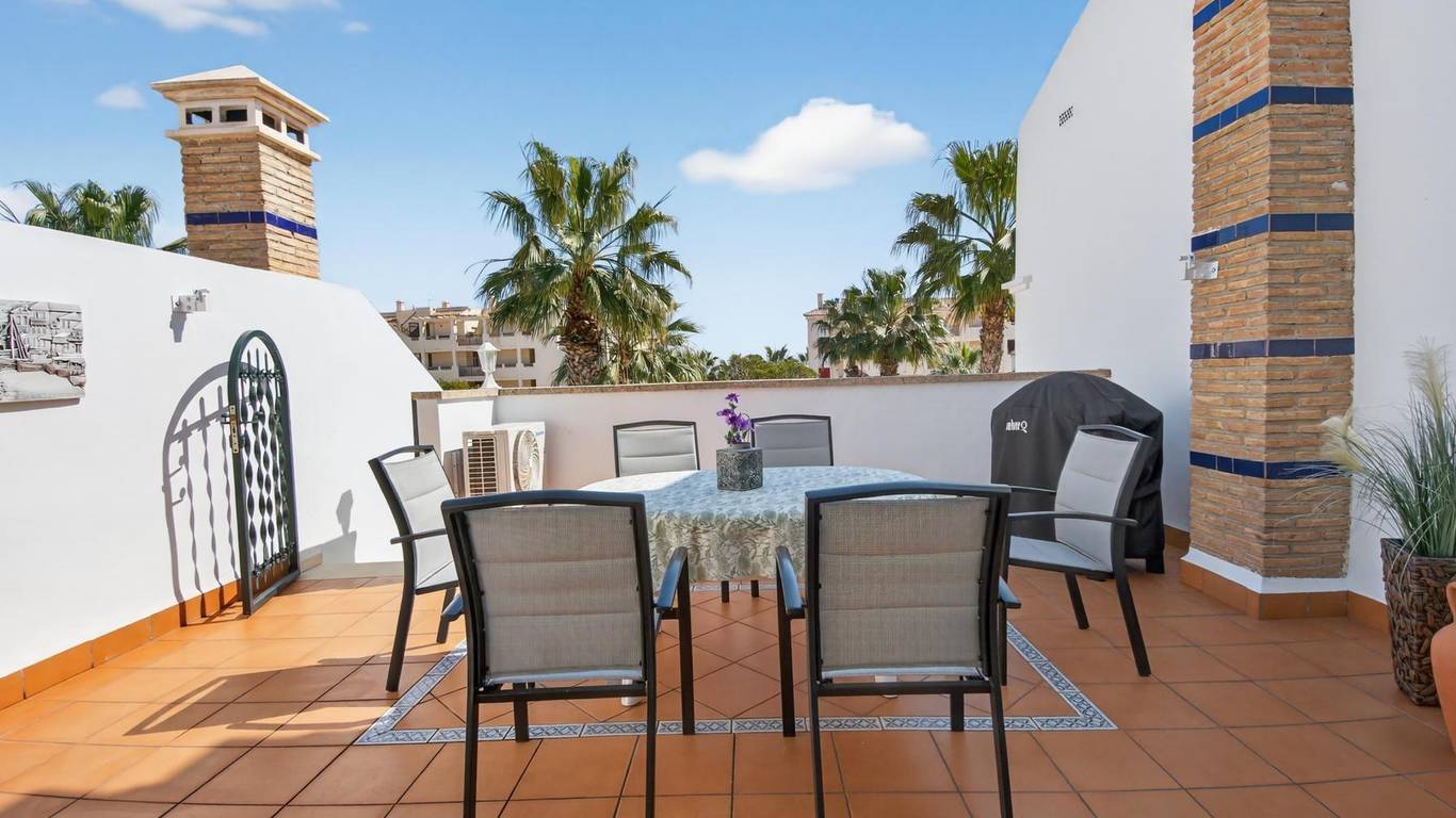 An external staircase leads to the solarium, where you will find a glazed multi-purpose area (currently used as a third bedroom) and an open-air space with a barbecue, perfect for enjoying time with family and friends while taking in the open views of the pool and residential complex.