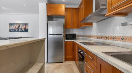 The living-dining area, with an open-plan American kitchen, creates a comfortable and functional space in excellent condition. The property is sold fully furnished and also includes electric radiators in the living room and master bedroom.