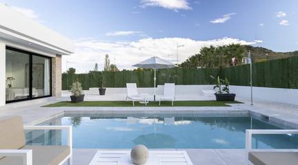MODERN VILLAS IN CALASPARRA WITH PRIVATE POOL New real estate development consisting of 215 independent villas in Calasparra. 170 villas will be built on plots of 545 m and 45 villas on plots of 1,250 m. 2 and 3 bedroom homes with a private pool of 24.5 m2 included, modern finishes and maximum qualities: Matt black aluminum windows, motorized blinds, armored entrance door to the house, white lacquered interior doors, aerothermal system for hot water production, quartz (silestone) countertop in kitchen, electrical appliances included, pre-installation of air conditioning by ducts.