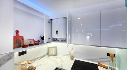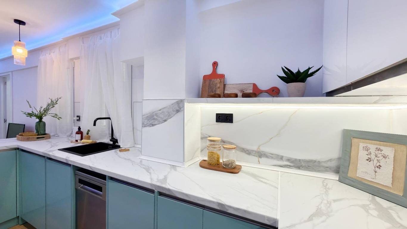The entire kitchen and living room area features perimeter LED lighting on the ceiling, allowing you to create different atmospheres depending on the time of day, from a warmer, more relaxed light to brighter, more functional lighting, adding a modern and elegant touch.
