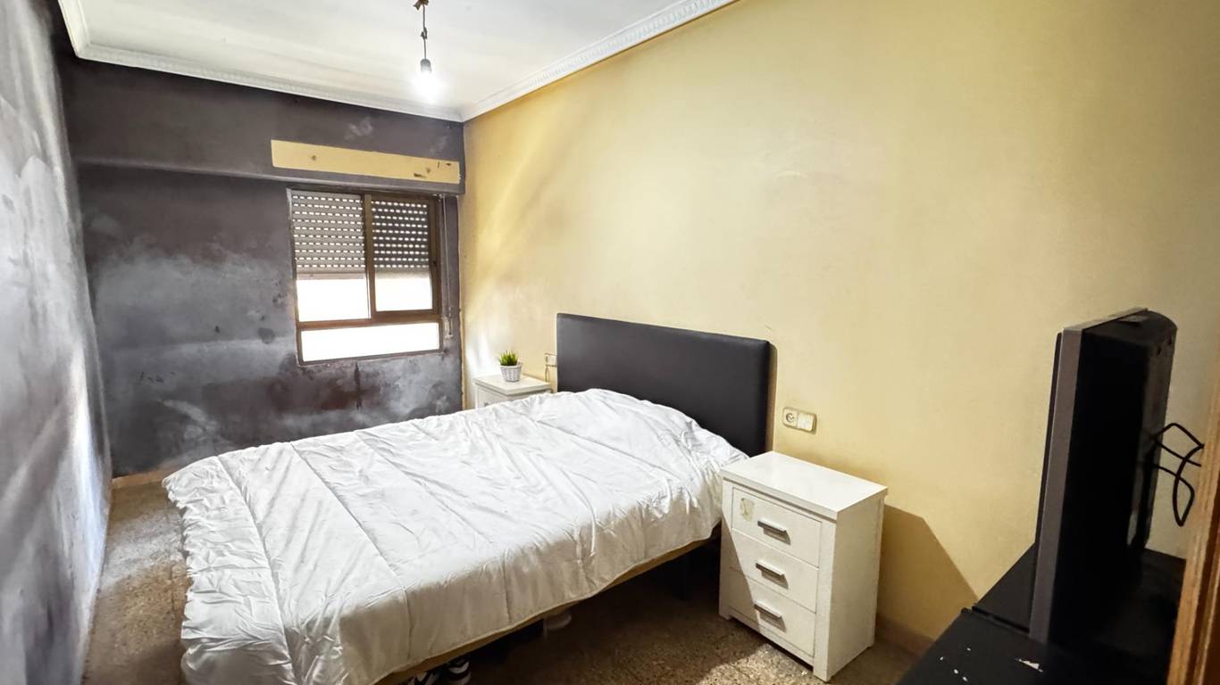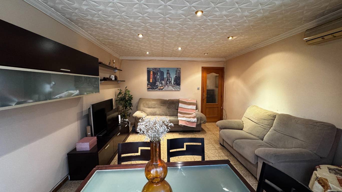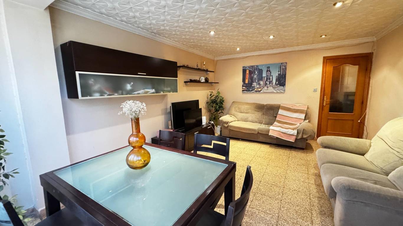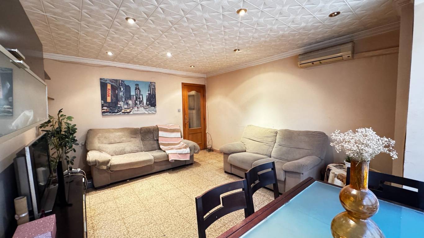The property features a spacious 18.5 m living-dining room (formerly with a balcony), three bedrooms, and a large kitchen with a storage room. The location is excellent: just a 1-minute walk from Amado Granell-Montolivet metro station, only two stops from Calle Alicante station, with direct underground connections to Bailén, Xàtiva and Estación del Norte, providing easy access to the airport.