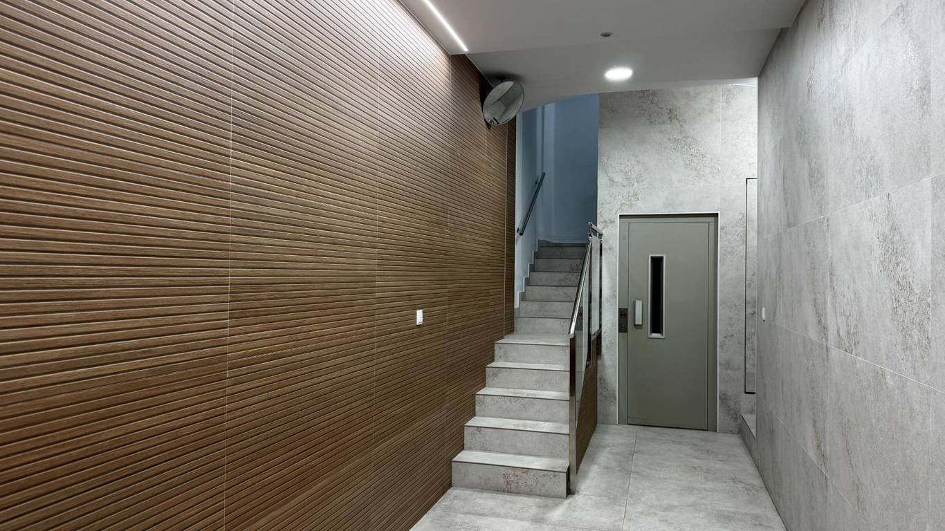 On the third floor, the entrance hall leads into a small corridor that opens into a bright living-dining area with two large reflective glass windows for added privacy, as well as lateral sunlight in the afternoons.