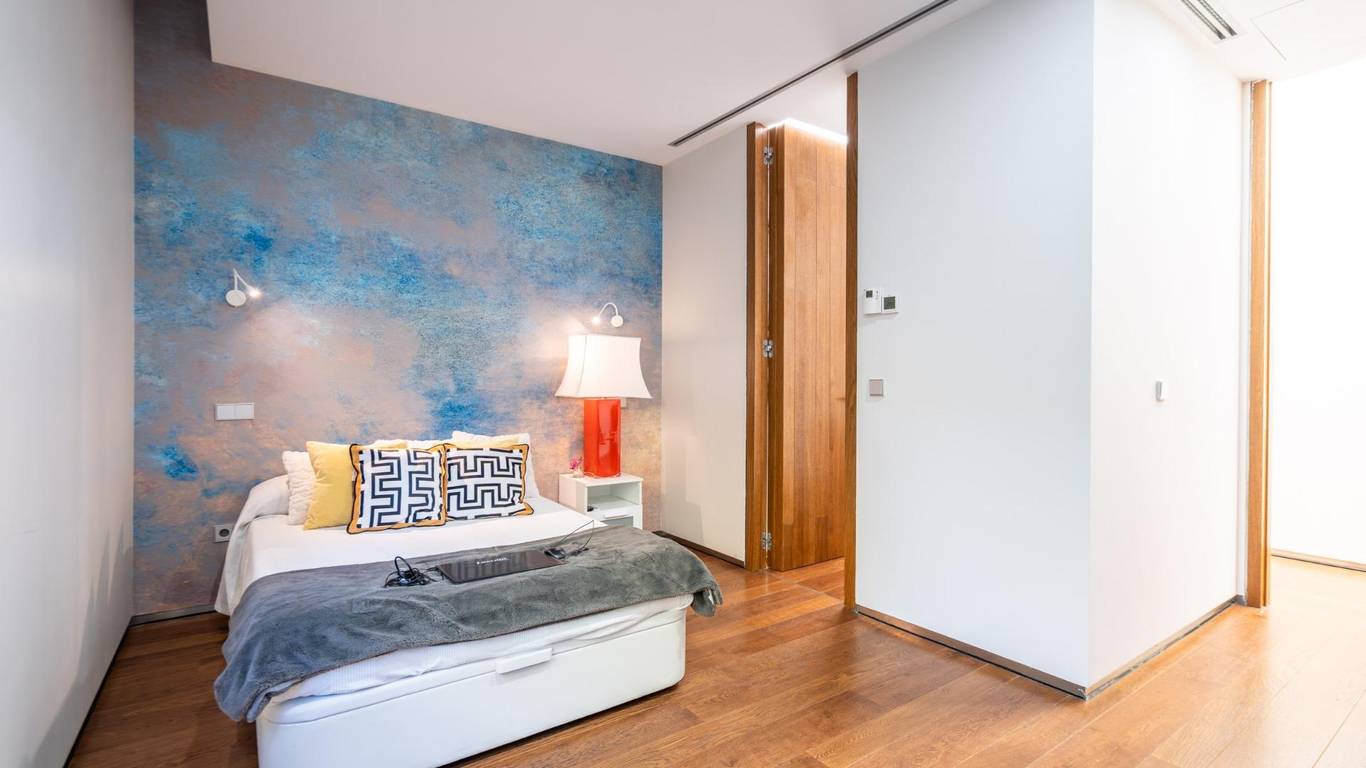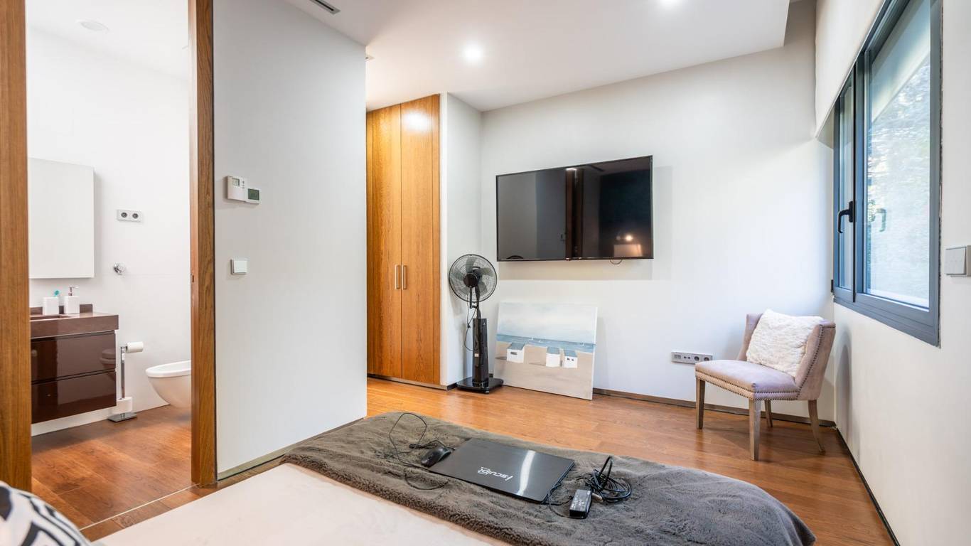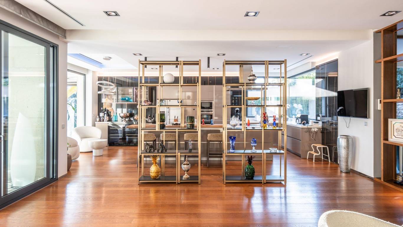 The upper floor houses an en-suite bedroom with a private terrace and an office area with access to an impressive terrace of over 200 sqm, offering unique views, especially at sunset.