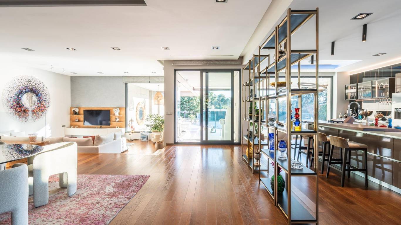 The large living-dining room of over 100 sqm, arranged on two levels, creates a striking yet cozy space. The kitchen, spacious and modern, features a central island and high-end appliances.