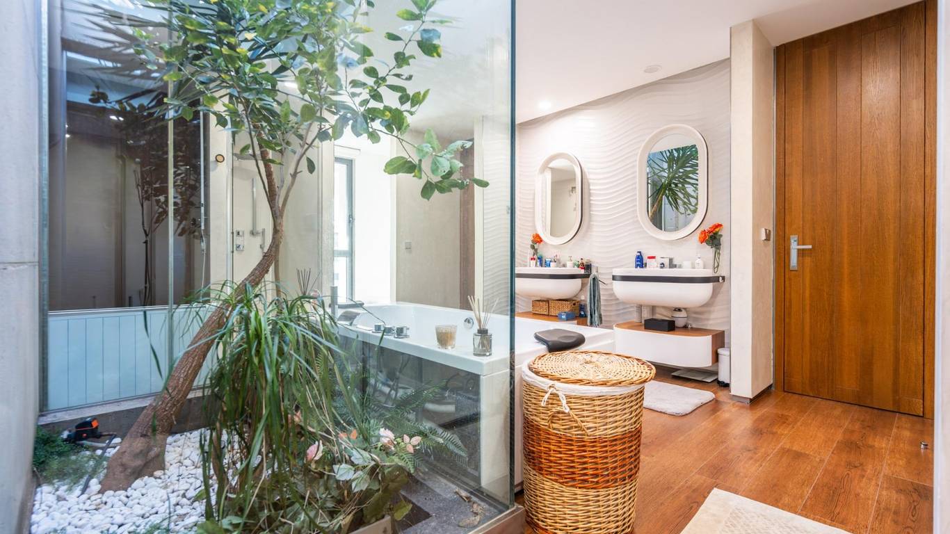 On the main floor, the property welcomes you with an elegant entrance hall that opens onto a spectacular English courtyard decorated with palm trees and bamboo, providing natural light and a unique aesthetic.