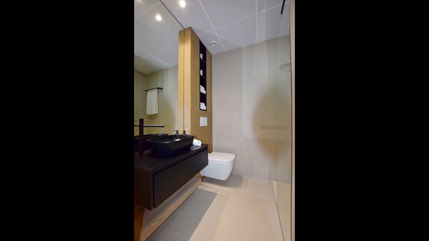 Lined wardrobes with drawers and shelves. Fully fitted bathrooms with vanity unit, suspended toilet, mirror, wall-mounted shower, shower screens and radiant heating on floor. Pre-installation for ducted air conditioning. Summer kitchen on the solarium. Solarium. Outdoor parking space.