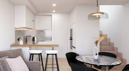 The development consists of 18 modern townhouses with 2 or 3 bedrooms and 2 bathrooms, designed with a contemporary open plan layout. Each home features a bright living and dining area connected to a fully fitted kitchen with appliances, creating a functional and comfortable living space.
