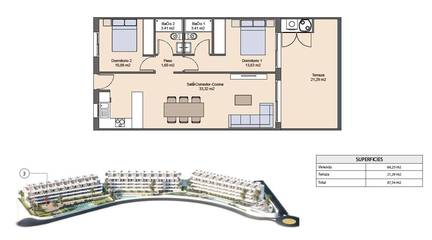 This gated residential complex features 99 modern apartments with 2 bedrooms and 2 bathrooms, just 2.3 km from the beaches of Benidorm, with breathtaking views of the Mediterranean Sea and the city skyline.