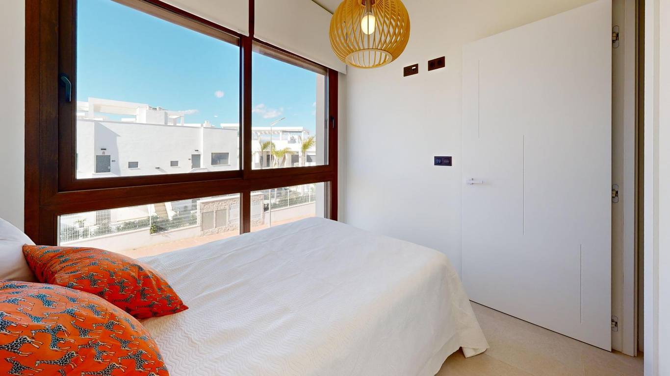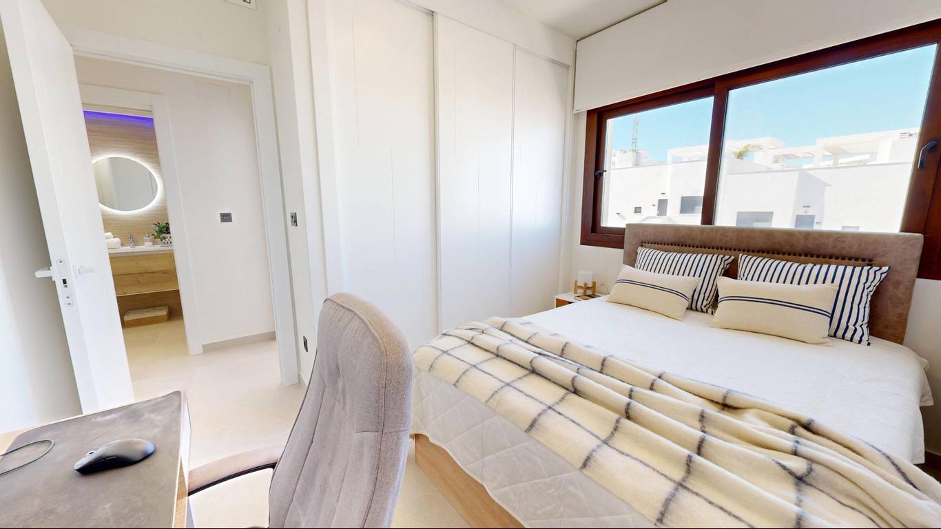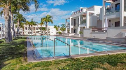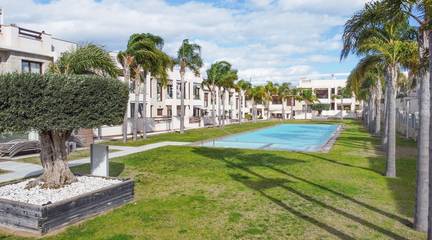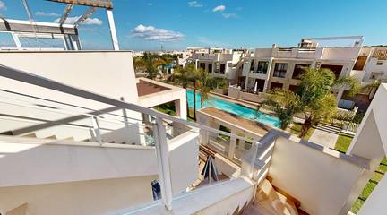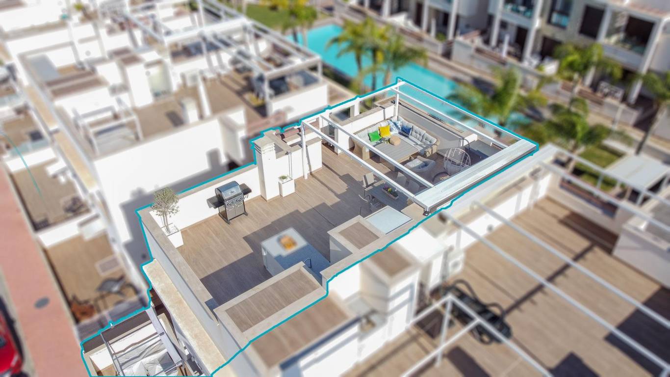 Here's everything you need to know about this property:- Bright, high-quality, top-floor bungalow with 73m built area (according to the land registry)- 70m solarium with shower, bar, and sink- 7m terrace- 3 bedrooms with built-in wardrobes- 2 full bathrooms, one ensuite with a hydromassage shower- Fully equipped open-plan kitchen- Spacious living/dining room with access to the terrace- Ducted air conditioning- Views of the gardens and pool- From the solarium, views of the pink lagoon, landscaped area, and pool- South-facing-