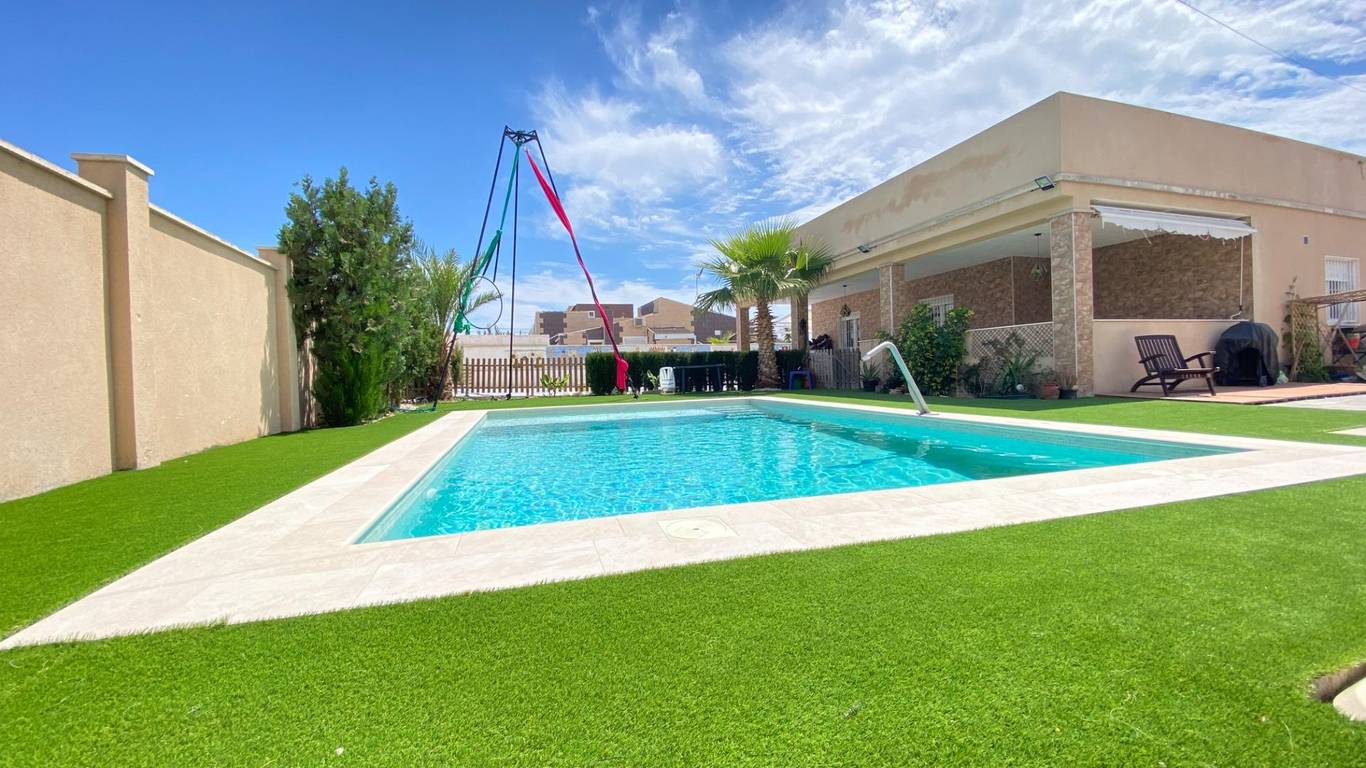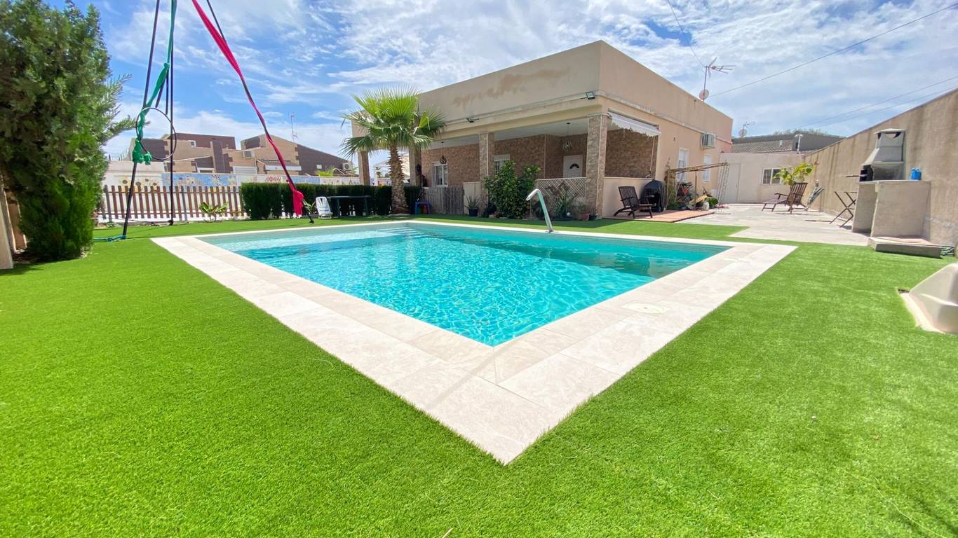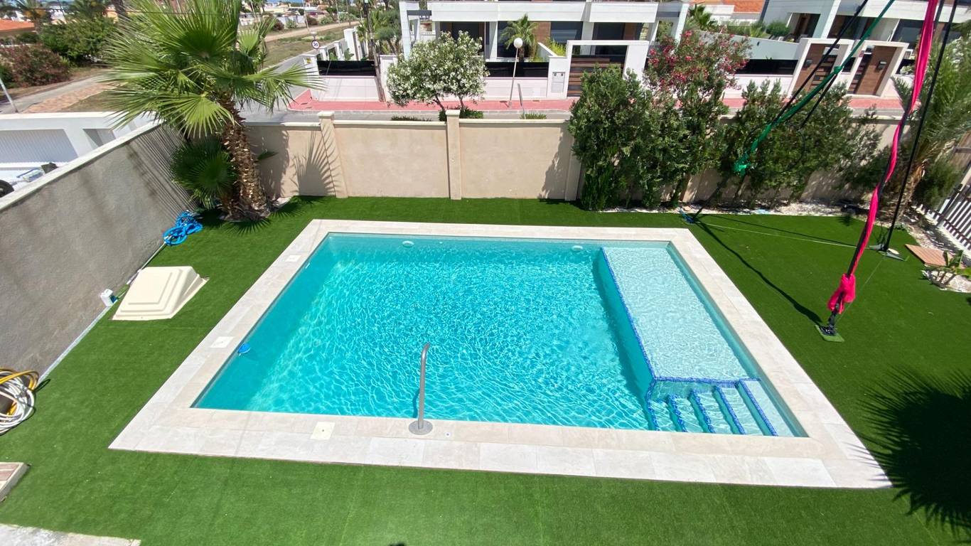 Outside, the highlight is a spacious swimming pool (8x5 meters) featuring a beach-style entrance and a spa jet, along with a large garden area with artificial grassideal for enjoying the outdoors.