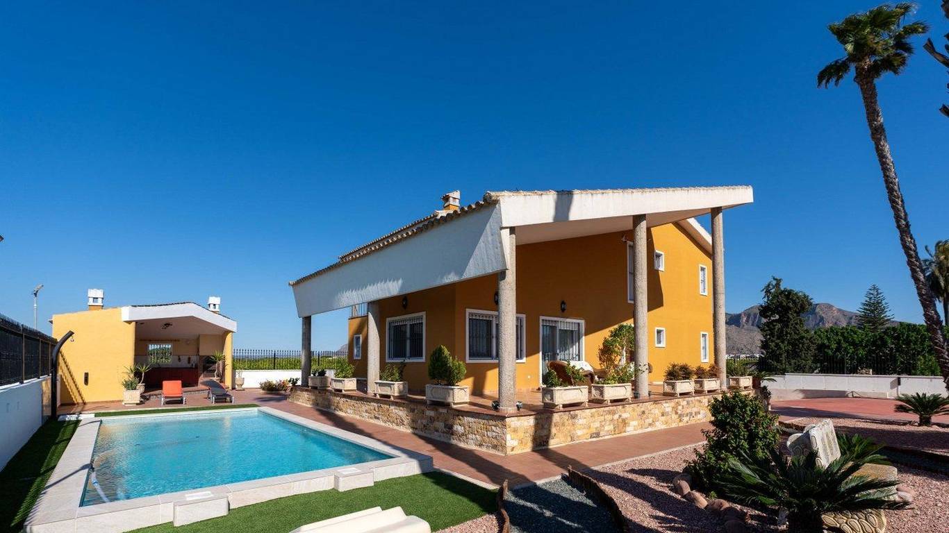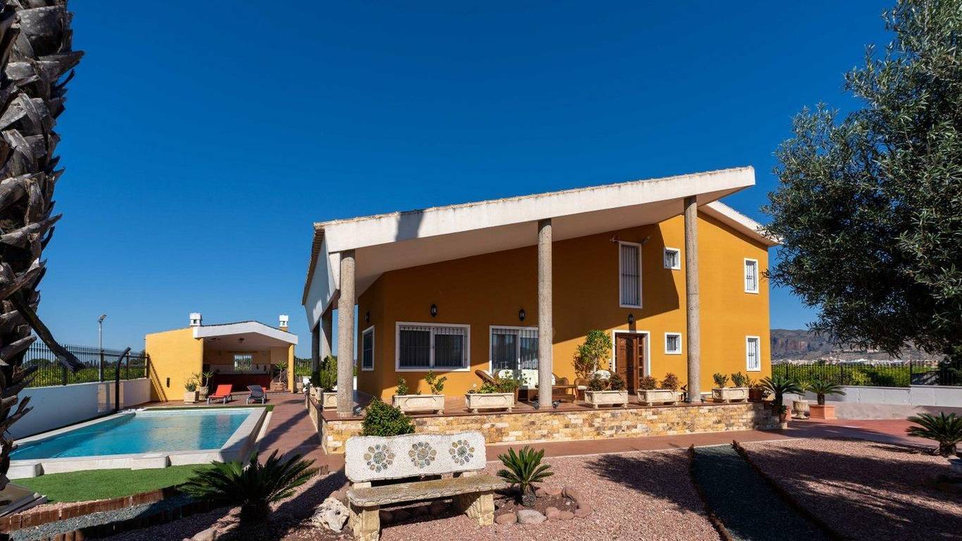 9,480 m2. fully fenced property with 495 m2. house built on a plot of 1,000 m2. all fenced within the perimeter of the property.The house is composed of three floors: - SEMI-BASEMENT FLOOR: 224 m2. ConstructedGarage for several vehicles, gym with shower, entertainment area, DIY area with shelves and bench, a bedroom, and a dressing room-shoe closet. - GROUND FLOOR: 178 m2. ConstructedDistributed in large living room, large kitchen with access to an outdoor barbecue area, separate pantry, laundry area with access to an outdoor terrace, 1 bathroom with shower, 1 bedroom with built-in closet and an office-room with access to an outdoor terrace. - SECOND FLOOR: 93 m2. ConstructedDistributed in a lookout area to the living room downstairs, master bedroom with balcony, bathroom with whirlpool tub and dressing room, 2 more bedrooms (one with built-in closet) and an extra bathroom with bathtub. AMENITIESCentral heating with boiler with water radiators and air conditioning ducts both throughout the house. Outdoor shed with air conditioning engines, heating boiler and gas-oil tank for maintenance. Grilles on all doors and windows with mosquito nets. Installation of Fiber Optic Internet.Building with access from the kitchen for a barbecue area with sink and oven. Swimming pool and garden with outdoors lighting. Access gates to the property and garage with motorized doors. The house is surrounded with a planted land with lemon verna in production and with traditional method of irrigation. PROPERTY LOCATIONThe property is in a quiet area, 5 minutes from the Carrefour shopping center and town center of Orihuela and Bigastro with good access by road and well connected to both towns. The house is surrounded by residential homes of similar characteristics, and it has an easy access by road and in its surroundings where you can find supermarkets, restaurants, and all necessary services.