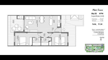 Bedrooms: 2, Bathrooms: 2 Total area: 75 m2 Living area: 65 m2