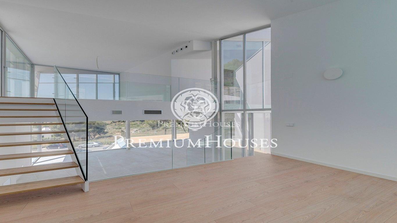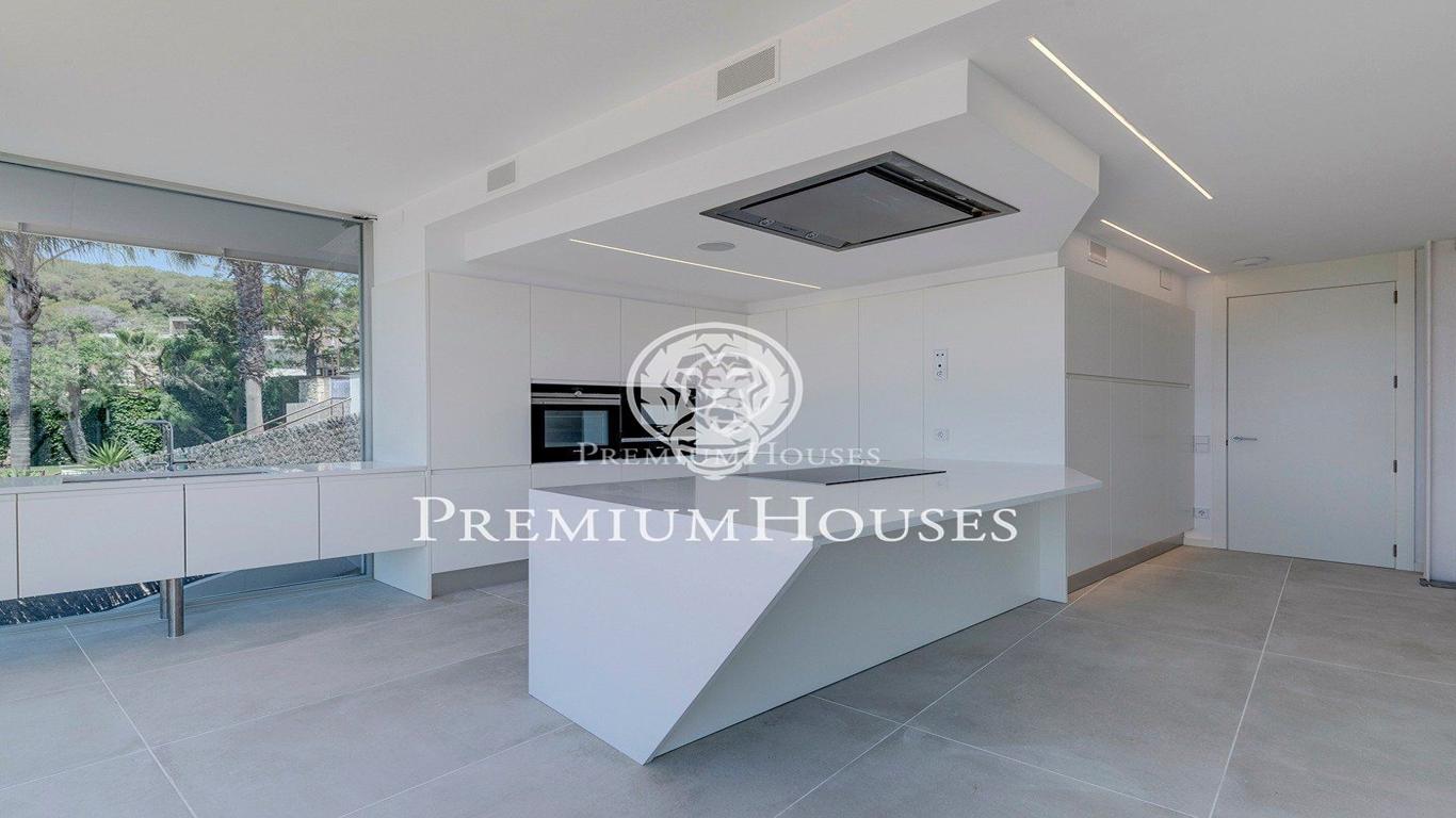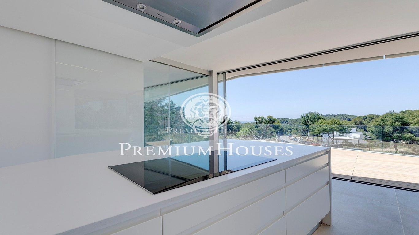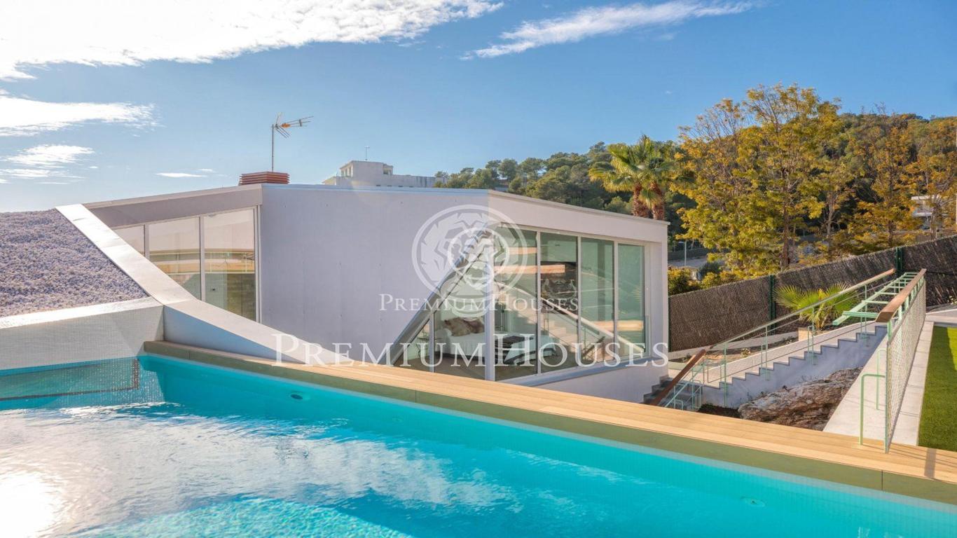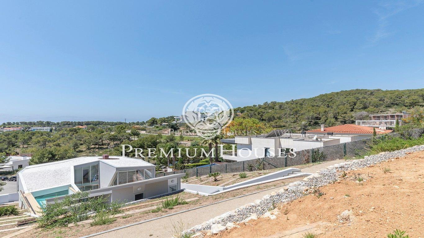 Spectacular home by renowned architect that is difficult to do justice to in the photographs. Open through large windows and glass walls to magnificent views of the sea and the golf course, with the latest advances in home automation and energy efficiency, with very high ceilings and large spaces, it was designed for a family looking for a modern home, of great privacy and tranquility and at the same time, close to the center of Sitges. From the main stone entrance there is access to a parking with capacity for at least three cars, washing-drying area and a room for the house machinery: aerothermal heating, water depurtion, water softener and swimming pool machines. Your access to the first floor with an elevator or through the stairs on the left side of the house, where there is a large and bright living room at two heights, which delights lovers of design and good taste, by the exquisite project in which the pool can be seen from the living room as it was a picture. The fully equipped kitchen with unbeatable sea views, as well as the living room, which have access to a terrace that has white aluminum enclosure system to obtain the greatest privacy. There is a bedroom with a built-in closet, with a full bathroom with shower. On the second floor, we can find 3 large bedrooms (one of them suite), all with fitted wardrobes. The suite has a full bathroom with shower convertible into a bathtub and the other two share a bathroom with shower. All rooms have terraces with magnificent views. The house is finished with high quality materials in bathrooms, kitchen, and exterior enclosure. The property has a private pool surrounded by terrain at different heights to create an incredible landscaping project, in the upper part it has two changing rooms with bathrooms, one with a shower and a designer washbasin and the other with a toilet and washbasin design. The exclusive and calm urbanization Can Girona, is located next to the Terramar golf course and just a few minutes from the center of Sitges. It is also very closed to prestigious international schools.