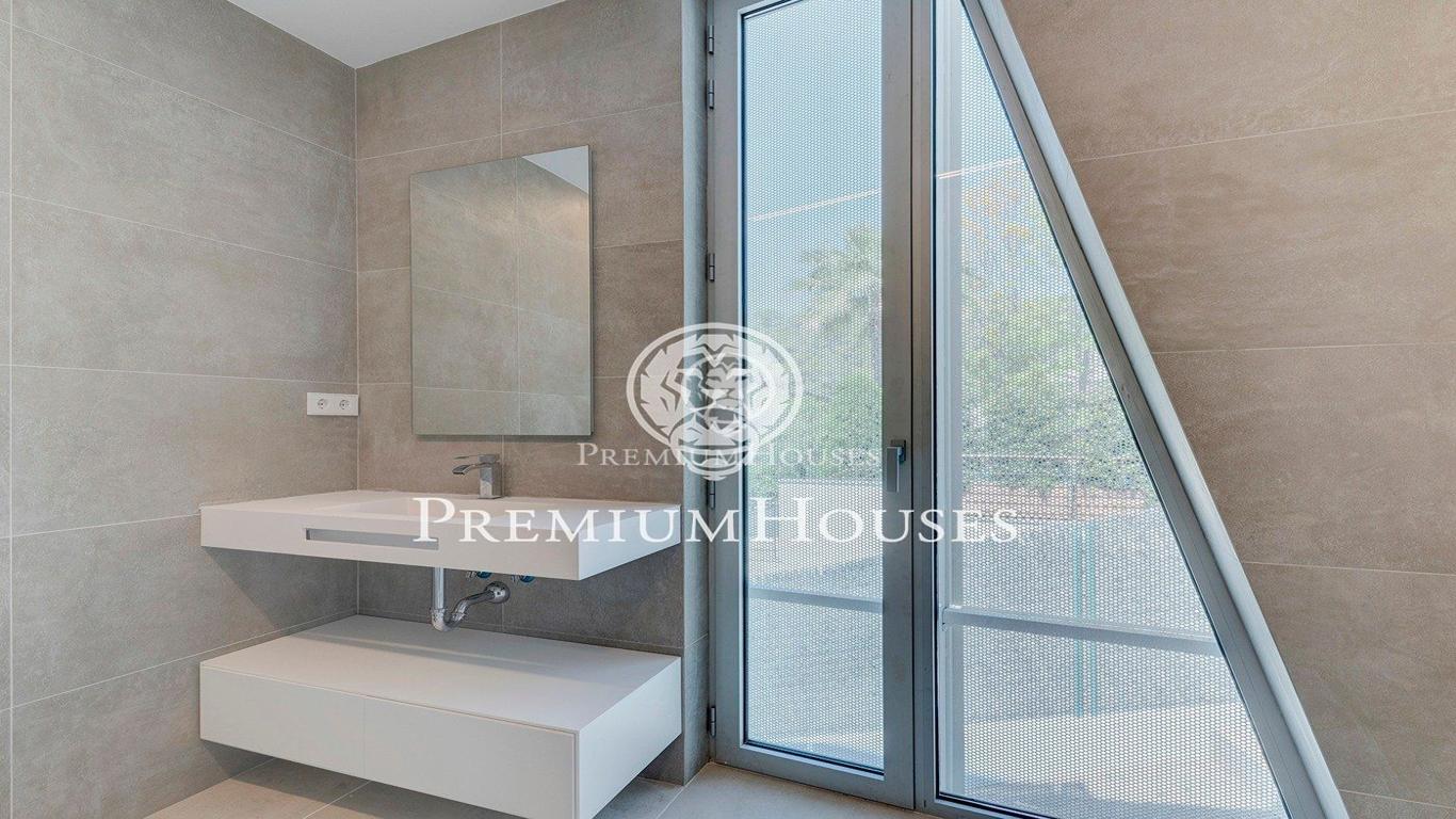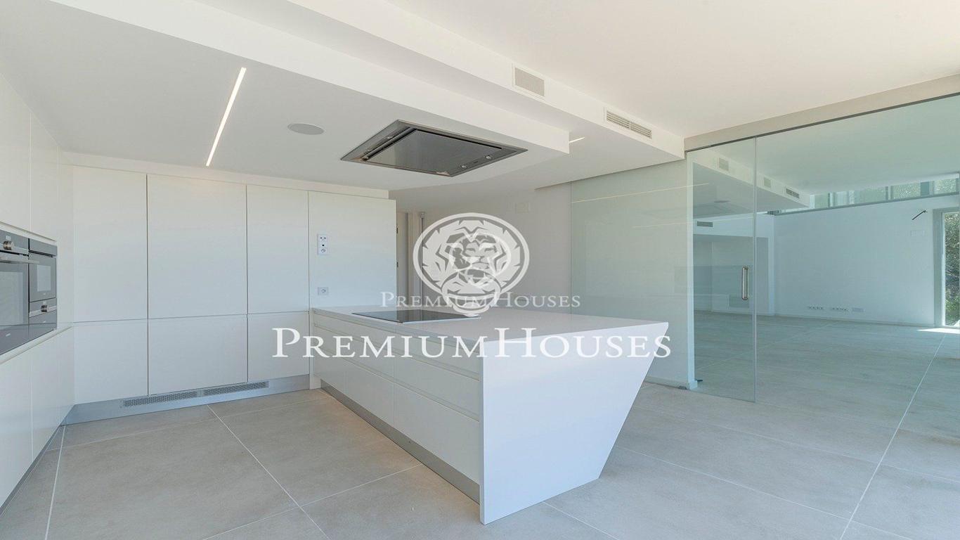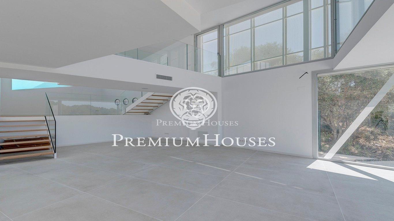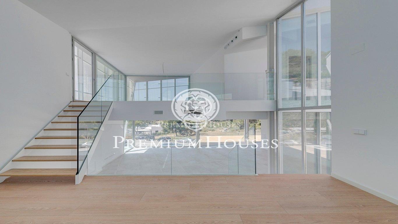 Spectacular home by renowned architect that is difficult to do justice to in the photographs. Open through large windows and glass walls to magnificent views of the sea and the golf course, with the latest advances in home automation and energy efficiency, with very high ceilings and large spaces, it was designed for a family looking for a modern home, of great privacy and tranquility and at the same time, close to the center of Sitges. From the main stone entrance there is access to a parking with capacity for at least three cars, washing-drying area and a room for the house machinery: aerothermal heating, water depurtion, water softener and swimming pool machines. Your access to the first floor with an elevator or through the stairs on the left side of the house, where there is a large and bright living room at two heights, which delights lovers of design and good taste, by the exquisite project in which the pool can be seen from the living room as it was a picture. The fully equipped kitchen with unbeatable sea views, as well as the living room, which have access to a terrace that has white aluminum enclosure system to obtain the greatest privacy. There is a bedroom with a built-in closet, with a full bathroom with shower. On the second floor, we can find 3 large bedrooms (one of them suite), all with fitted wardrobes. The suite has a full bathroom with shower convertible into a bathtub and the other two share a bathroom with shower. All rooms have terraces with magnificent views. The house is finished with high quality materials in bathrooms, kitchen, and exterior enclosure. The property has a private pool surrounded by terrain at different heights to create an incredible landscaping project, in the upper part it has two changing rooms with bathrooms, one with a shower and a designer washbasin and the other with a toilet and washbasin design. The exclusive and calm urbanization Can Girona, is located next to the Terramar golf course and just a few minutes from the center of Sitges. It is also very closed to prestigious international schools.
