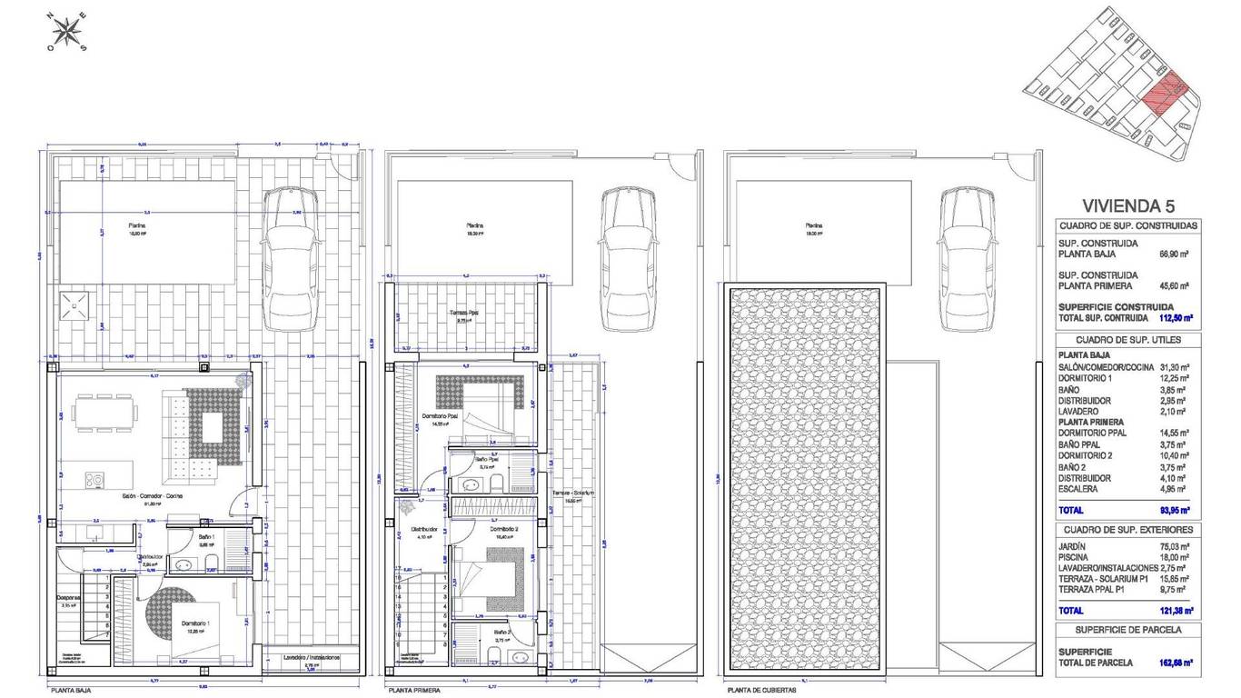 Modern New Build Villas in San Pedro del Pinatar with Private PoolElegant Design and Premium QualityWelcome to the second phase of an exclusive development in San Pedro del Pinatar, where modernity meets functionality. These 12 semi-detached villas are crafted with a minimalist design and high-quality finishes, offering a sophisticated and stylish living experience. Each villa features 3 spacious bedrooms, 3 bathrooms, and a private pool, along with terraces and a private garden. This is the perfect sanctuary for those seeking tranquility, privacy, and unparalleled comfort.Thoughtfully Designed Homes for Modern LivingThese new-build villas boast an open-plan kitchen connected to a bright living area, creating a seamless space for family living and entertaining. Key features include:3 bedrooms with built-in wardrobes.3 bathrooms with transparent glass shower screens for a sleek look.Private pool and garden, perfect for relaxing outdoors.First-floor terraces and an optional rooftop solarium for sunbathing.Parking space on the plot.Large windows in the living room provide direct access to the pool area, flooding the interior with natural light. Energy-efficient additions like solar panels and pre-installed ducted air conditioning ensure modern comfort and sustainability. Included appliances by Balay (induction hob, oven, microwave, extractor, refrigerator, integrated dishwasher, and washing machine) make moving in effortless.Prime Location in San Pedro del PinatarLocated on the beautiful Mar Menor and Mediterranean coast, San Pedro del Pinatar is a dream destination for water sports enthusiasts and beach lovers. The area is renowned for its serene beaches, natural mud baths, and vibrant marina, offering year-round activities in a mild climate.Points of interest near these villas include:Dos Mares Shopping Center: 5 km (5 minutes by car).Murcia-Corvera Airport: 30 km (30 minutes by car).Alicante Airport: 80 km (1 hour by car).Local golf courses: Various options within 1015 km.Lo Pagán beaches: Just a short 3 km drive away.The neighborhood is well-served by schools, sports facilities, shops, and public transport, making it ideal for families and retirees alike.Discover Your Dream Home TodayDont miss the chance to own one of these exclusive villas in a thriving community. Experience the best of coastal living and make San Pedro del Pinatar your new home. Contact us now to schedule a viewing and secure your piece of paradise