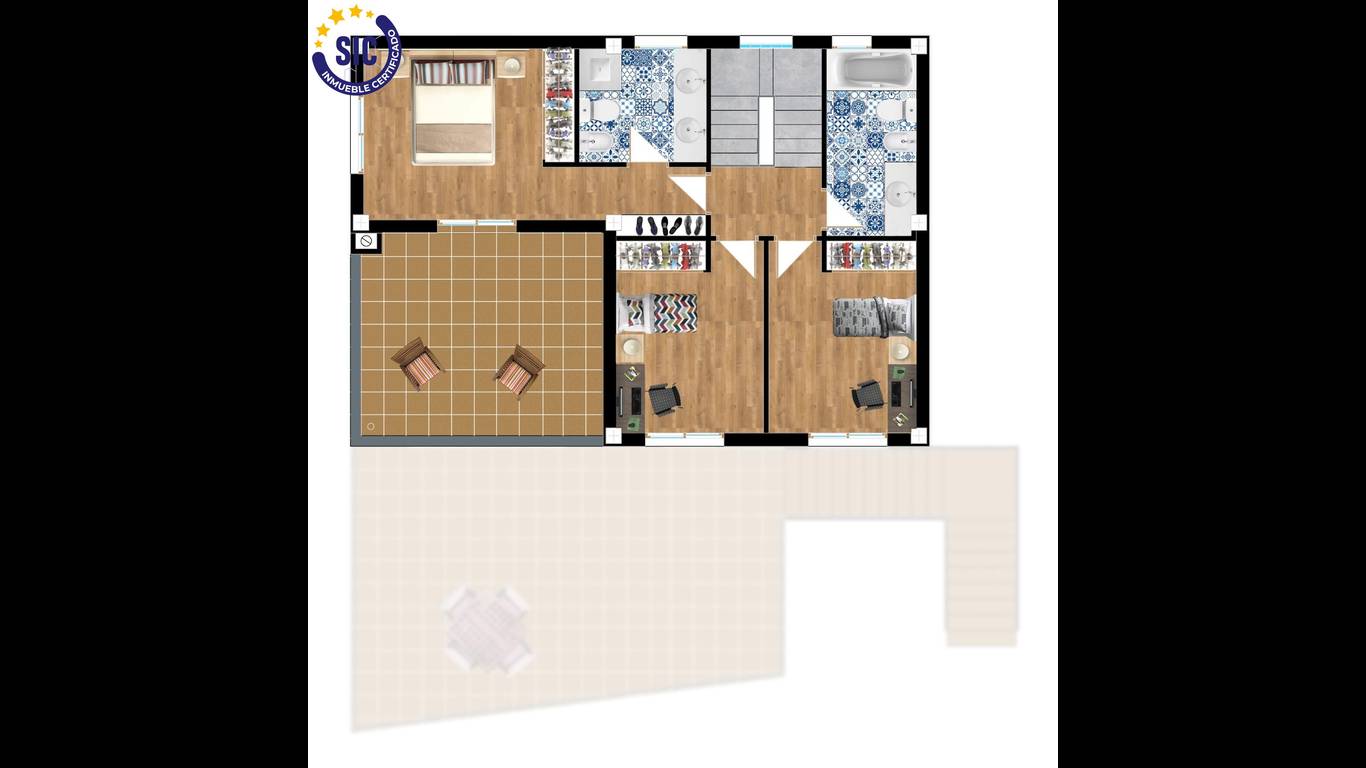 Planta Primera: Tres dormitorios, incluyendo un dormitorio principal con acceso a una bonita terraza con vistas, y dos baños completos.