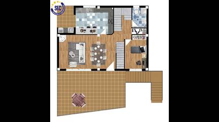 Planta Baja: Cocina, salón comedor con acceso a una amplia terraza con vistas a la montaña, un dormitorio y aseo con ducha.