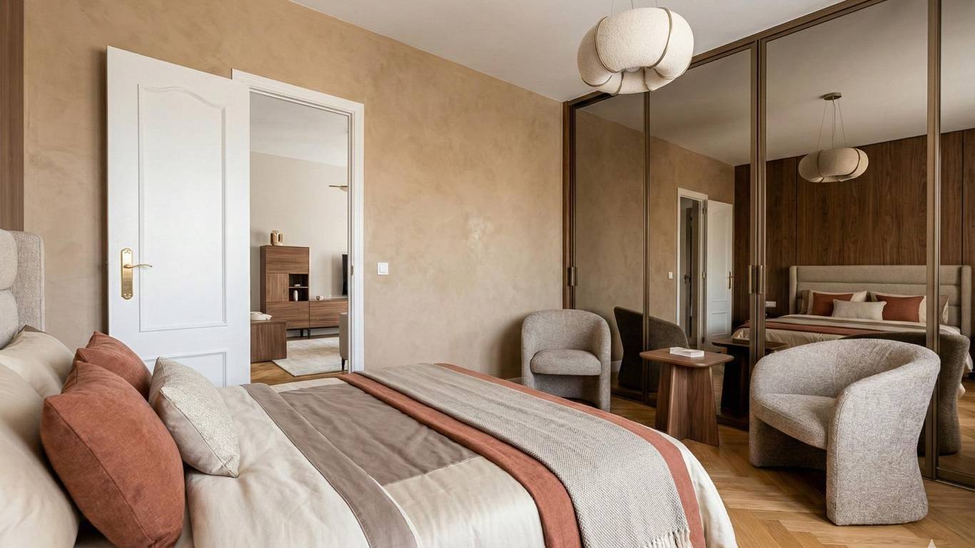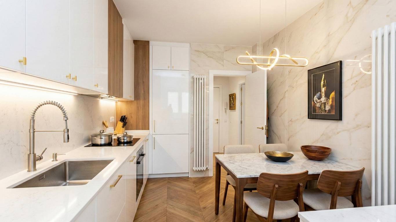 Es muy luminoso gracias a su altura en la octava planta, a que es totalmente exterior haciendo esquina, a su doble orientación norte y oeste, y a su terraza perimetral que rodea toda la vivienda. Actualmente se distribuye en cuatro habitaciones, la principal con baño en suite y todas con armarios empotrados, tres cuartos de baño, un amplio salón comedor con salida a la terraza, una buena cocina independiente con terraza tendedero y un hall recibidor. Los planos en tres dimensiones de este anuncio ofrecen la recreación en 3D de una posible reforma. También se han tratado con inteligencia artificial las fotos de algunas estancias para ofrecer la imagen de cómo podrían quedar reformadas.