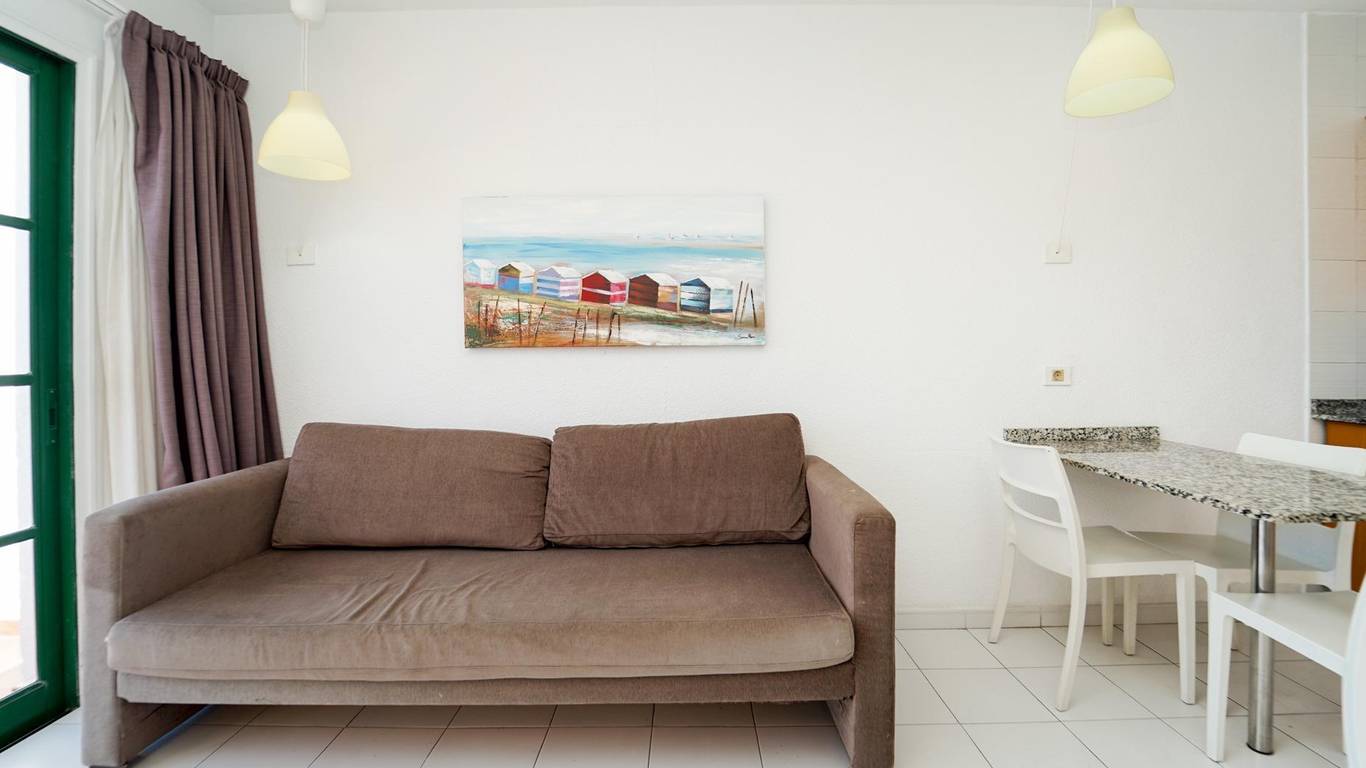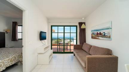 Wohnung mit einem Schlafzimmer, großes Wohnzimmer mit offener Küche, ein Badezimmer und Terrasse.