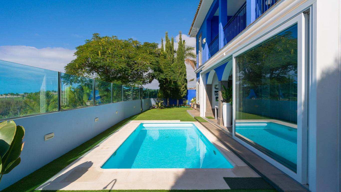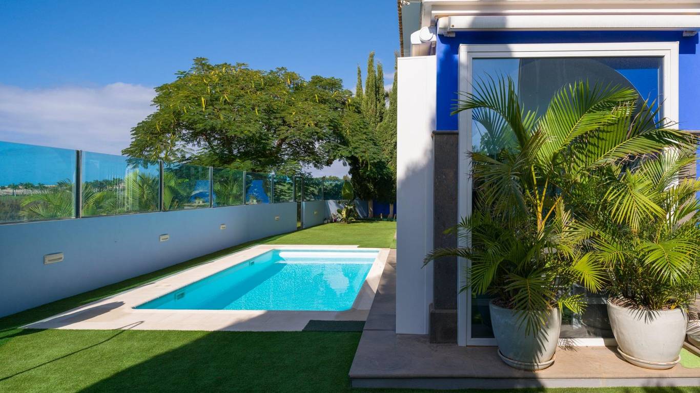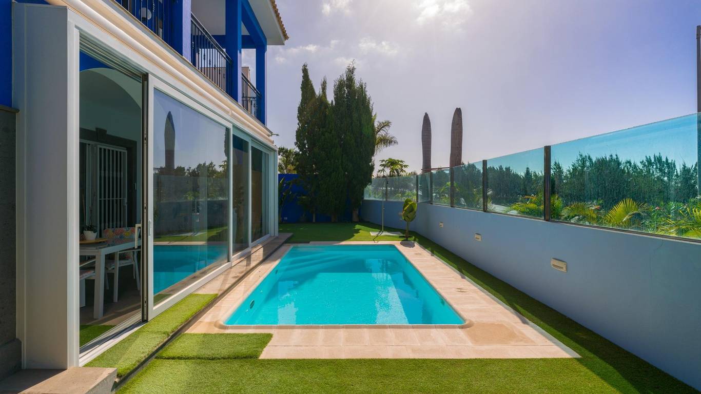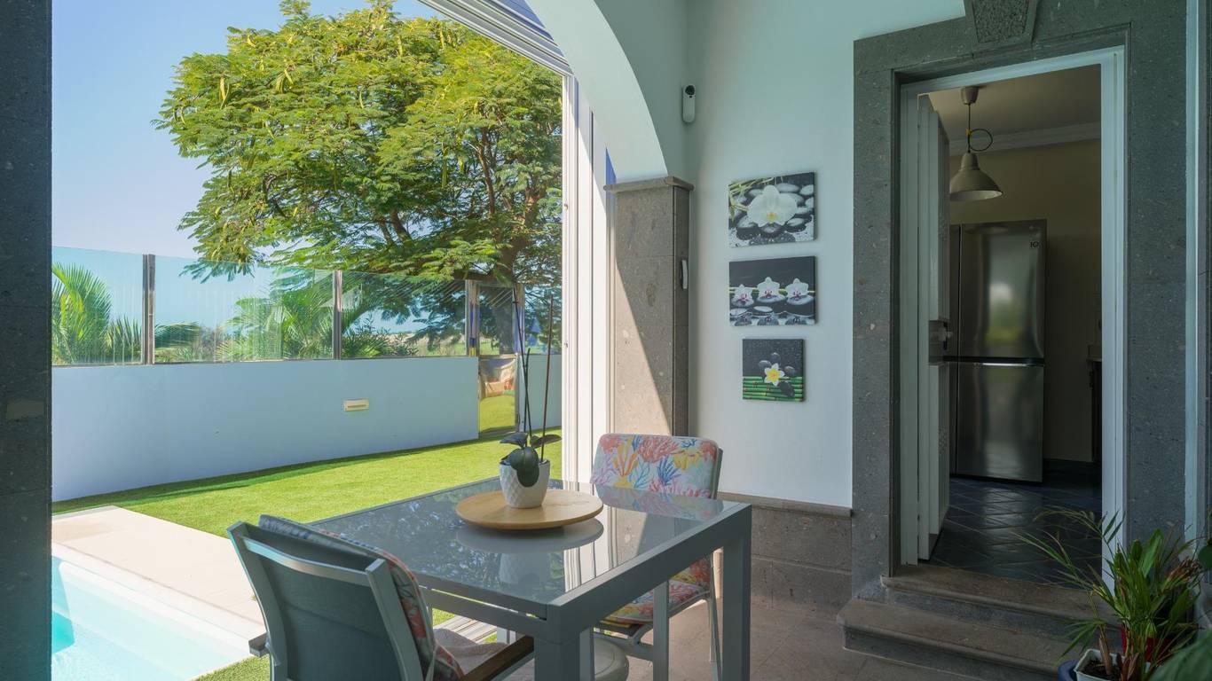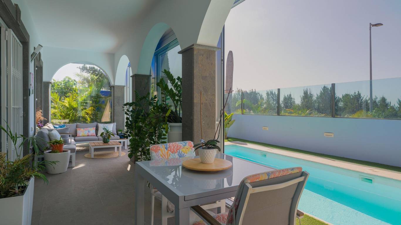 Spektakuläres freistehendes Chalet in einer der exklusivsten Wohngegenden von El Hornillo Meloneras, nur wenige Minuten vom Golfplatz, der Strandpromenade von Meloneras und mit hervorragender Anbindung an die Autobahn GC-1 entfernt.