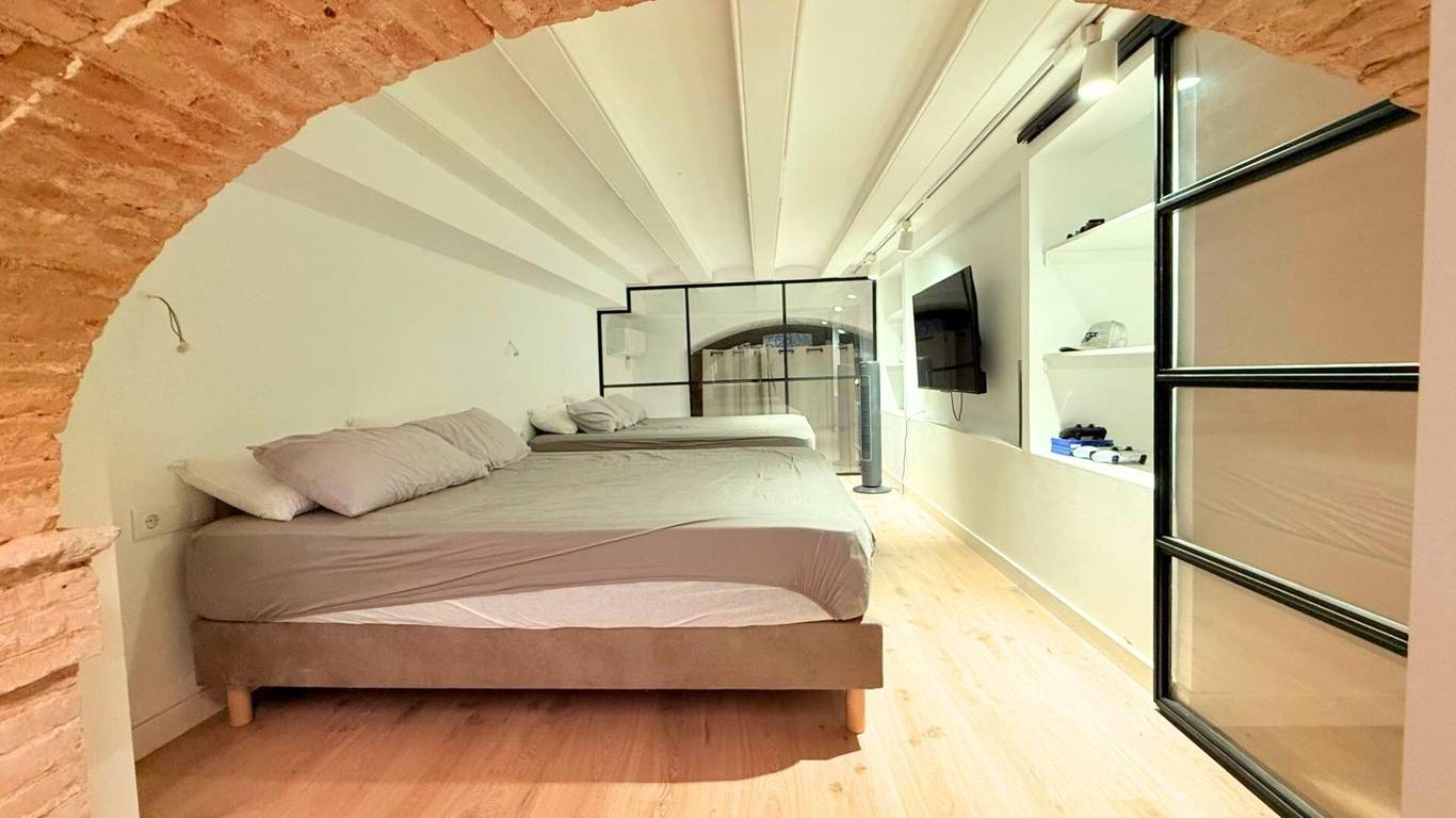 Im Obergeschoss, auf 25 m, liegt das zweite Schlafzimmer, vorbereitet für zwei Doppelbetten und ebenfalls mit einem Bad en suite mit Dusche ausgestattet. Erneut wurden originale Elemente wie ein Ziegelbogen bewahrt, die der Wohnung eine besondere, fast schon romantische Atmosphäre verleihen.
